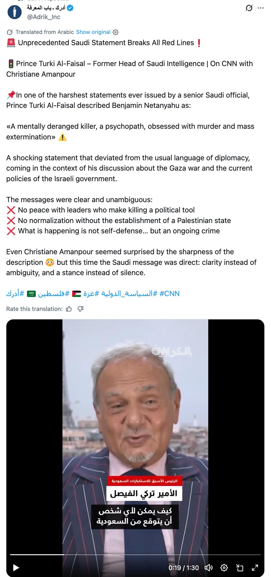 Unprecedented Saudi Statement Breaks All Red LinesPrince Turki Al-Faisal – Former Head of Saudi Intelligence on CNN with Christiane Amanpour In one of the harshest statements ever issued by a senior Saudi official, Prince Turki Al-Faisal described Benjamin Netanyahu as:‼ A mentally deranged killer, a psychopath, obsessed with murder and mass extermination» A shocking statement that deviated from the usual language of diplomacy, coming in the context of his discussion about the Gaza war and the current policies of the Israeli government.The messages were clear and unambiguous:‼ No peace with leaders who make killing a political tool‼ No normalization without the establishment of a Palestinian state‼ What is happening is not self-defense… but an ongoing crimeEven Christiane Amanpour seemed surprised by the sharpness of the description but this time the Saudi message was direct: clarity instead of ambiguity, and a stance instead of silence.
