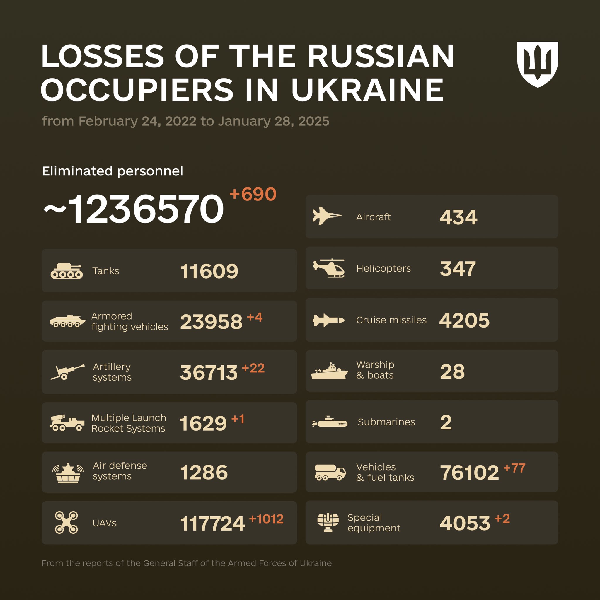 Previous: >>527277326Day 1,436 – Daily assessment: understandingwar.org/analysis/russia-ukraine/#research▶Latest>Iranian sources say Iran’s navy will hold joint military exercises with China and russia>lavrov: The truce sought by Zelensky is unacceptable to russia>russian losses in Ukraine 'more than any major power' in any war since World War II>Ukrainian military stats say four out of five Russian military targets destroyed or damaged in combat in 2025 were taken out by a drone.>Atesh Sabotage Cuts Power to Russian Military Plant in Udmurtia>Zelensky prepared for a face-to-face meeting with monke - Sybiha>russians Are Withdrawing Money from the Banking System en Masse>Iran gave russia over 350 Fath-360 missiles. Ukraine has yet to see one launched - HUR>Czech raise over €5.4m to fund generators, heaters for Ukraine>The 27 EU countries have given their final approval to fully ban russian LNG imports by 1 January 2027 and russian pipeline gas by 30 September 2027>G7+ to transfer 6k+ units of large energy equipment to Ukraine>Enhels without heating for 10 days at -25°C>Khamenei in a bunker as USS Abraham Lincoln arrives near Iran>Blackouts in Murmans'k, Sieveromors'k, Bilhorod, Bryans'k, Orel, Tahanrih, Rostov. Zakams'k is blacked out at -23°C>Massive attack on western russia>Next US-Ukraine-russia talks set for February 1>France seizes suspected russian 'shadow fleet' tanker>Luxembourg becomes first European country to issue defence bonds>Too early to drawn conclusions from Abu Dhabi talks - Zelenskyy▶Telegramrentry.org/telosint2023t.me/ukr_pics▶Intelt.me/DeepStateENodin.tradoc.army.mil/WEG (equipment explorer)ukr.warspotting.net (visually confirmed losses)▶Mapsdeepstatemap.live/enliveuamap.com/en▶DISPOSABLE SOLDIER (diary of a RU mobik)TOURS 1-4: files.catbox.moe/mpcw7p.zip▶12 min of TZD in one ditch (Pokrovsk area) - 28 killedfiles.catbox.moe/sxbxfb.mp4