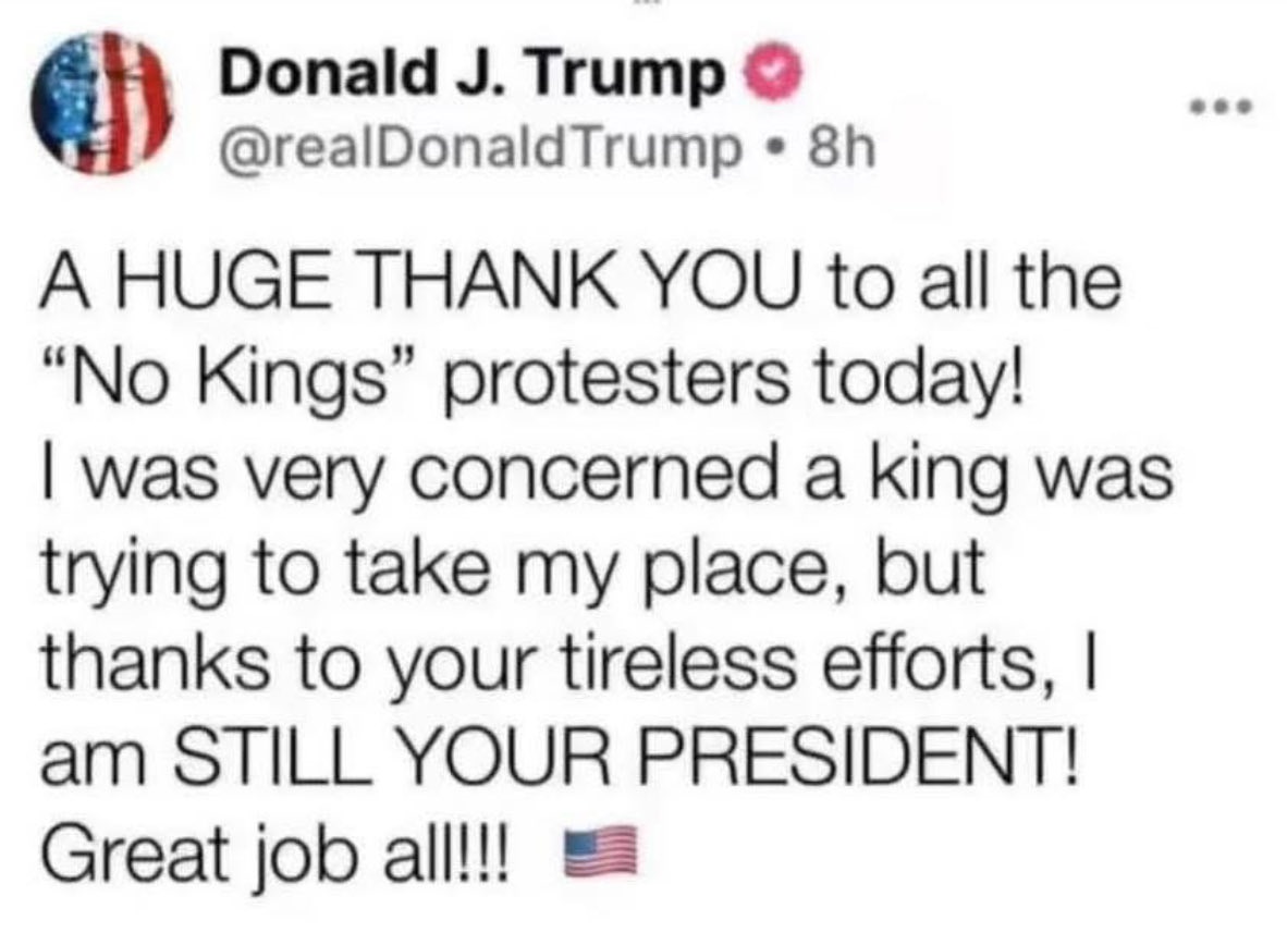 >>527309218for the record, not real. I thought it was funny thoughhuffpost article: https://www.huffpost.com/entry/joe-rogan-trump-hoax-no-kings_n_68fa2bbfe4b039323453e1a6donald trump jr saying it's not real: https://www.instagram.com/p/DK95cquutSX/?hl=en