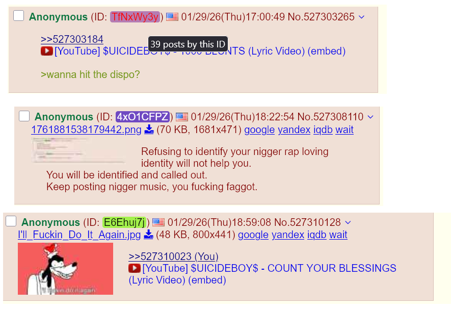 >>527309750The retarded nigger posting faggot nigger rap videos was hiding last thread.He posts 30+ times a thread, until you call him out.After pointing him out, no one makes 20+ posts.He's clearly a nigger, employed to post, until he gets noticed.After he is noticed, he hides.