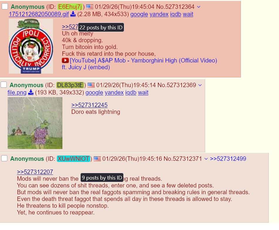 >>527312207Mods will never ban the faggots spamming real threads.You can see dozens of shit threads, enter one, and see a few deleted posts.But mods will never ban the real faggots spamming and breaking rules in general threads.Even the death threat faggot that spends all day in these threads is allowed to stay.He threatens to kill people nonstop.Yet, he continues to reappear.