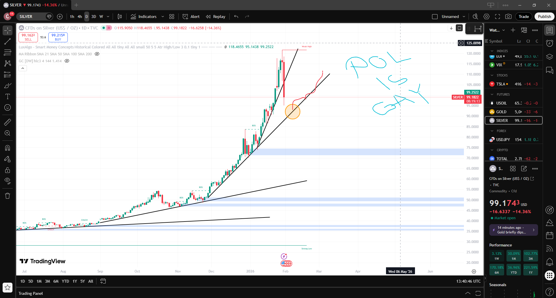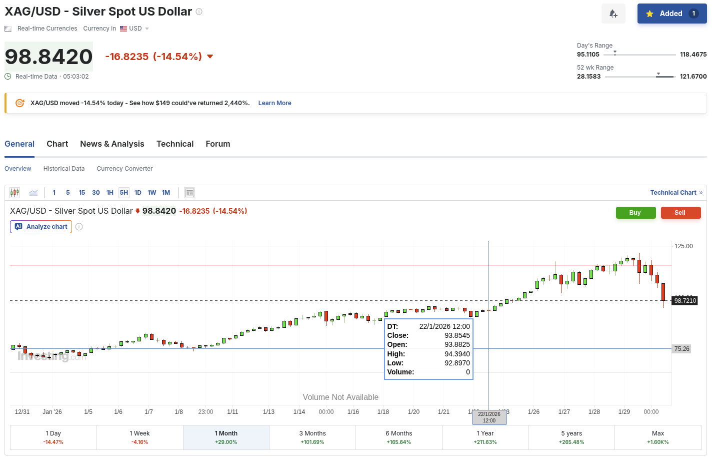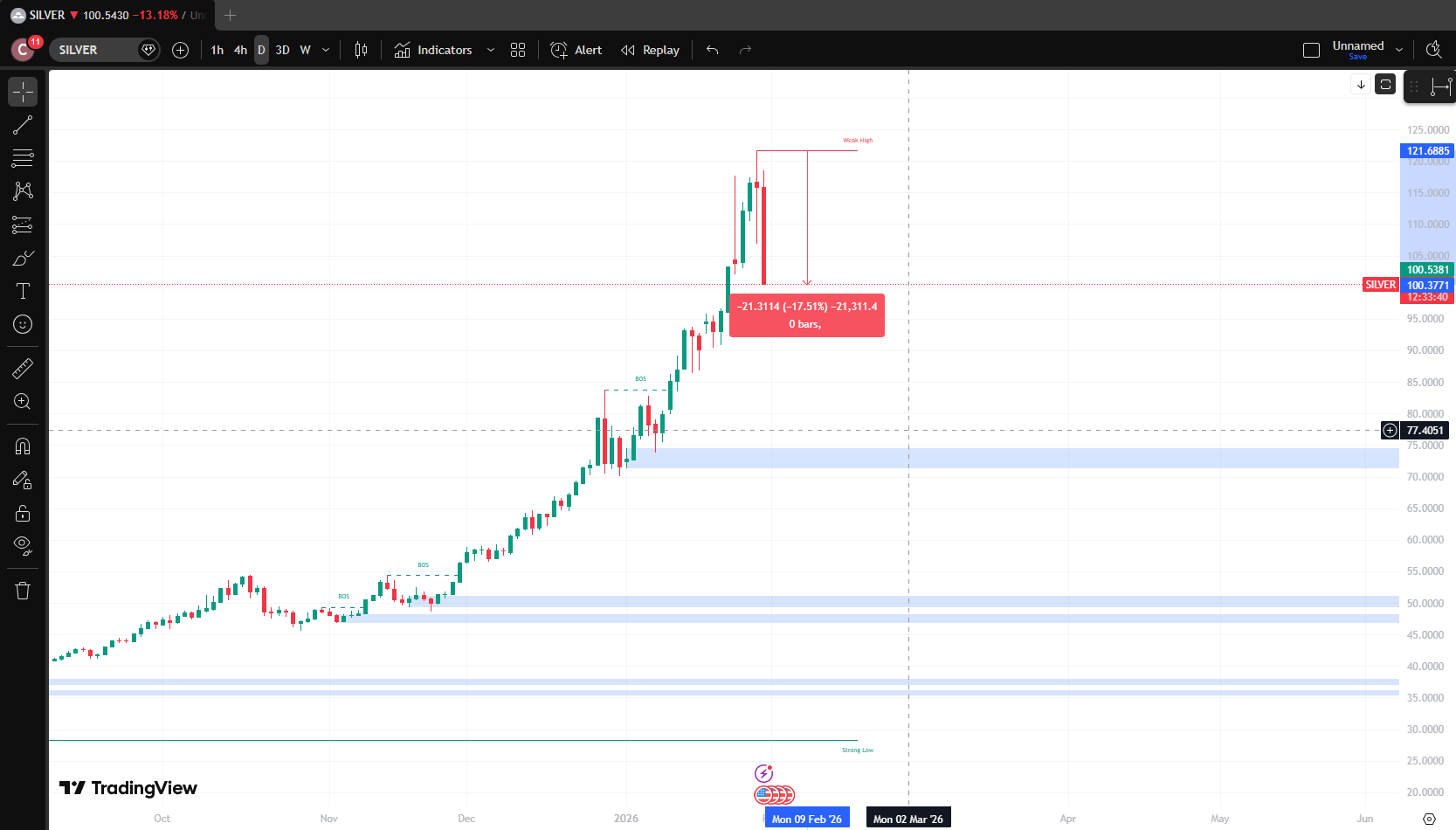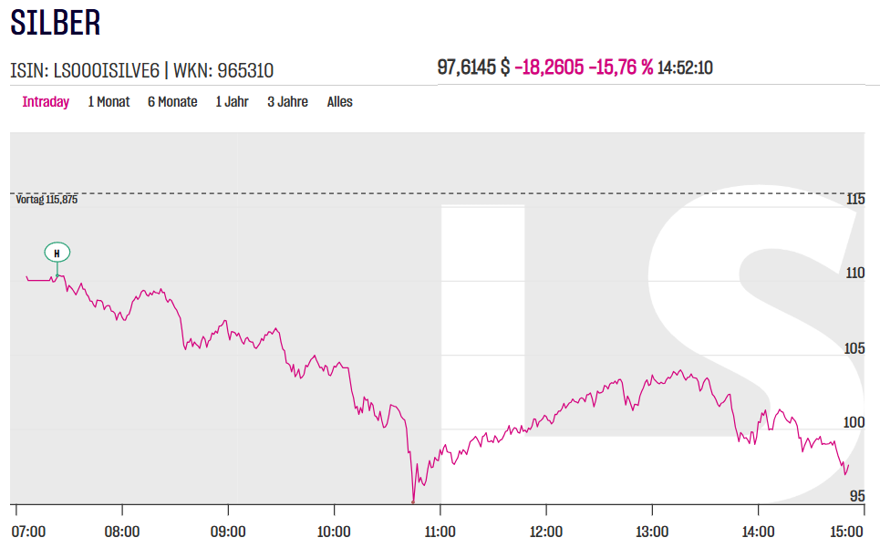 >>527326262I'm speculating on falling silver since yesterday and it is looking good for now. It really fits the description of a bubble bursting, so there might be a second peak, lower than the first one at 120 when the dumb money buys.