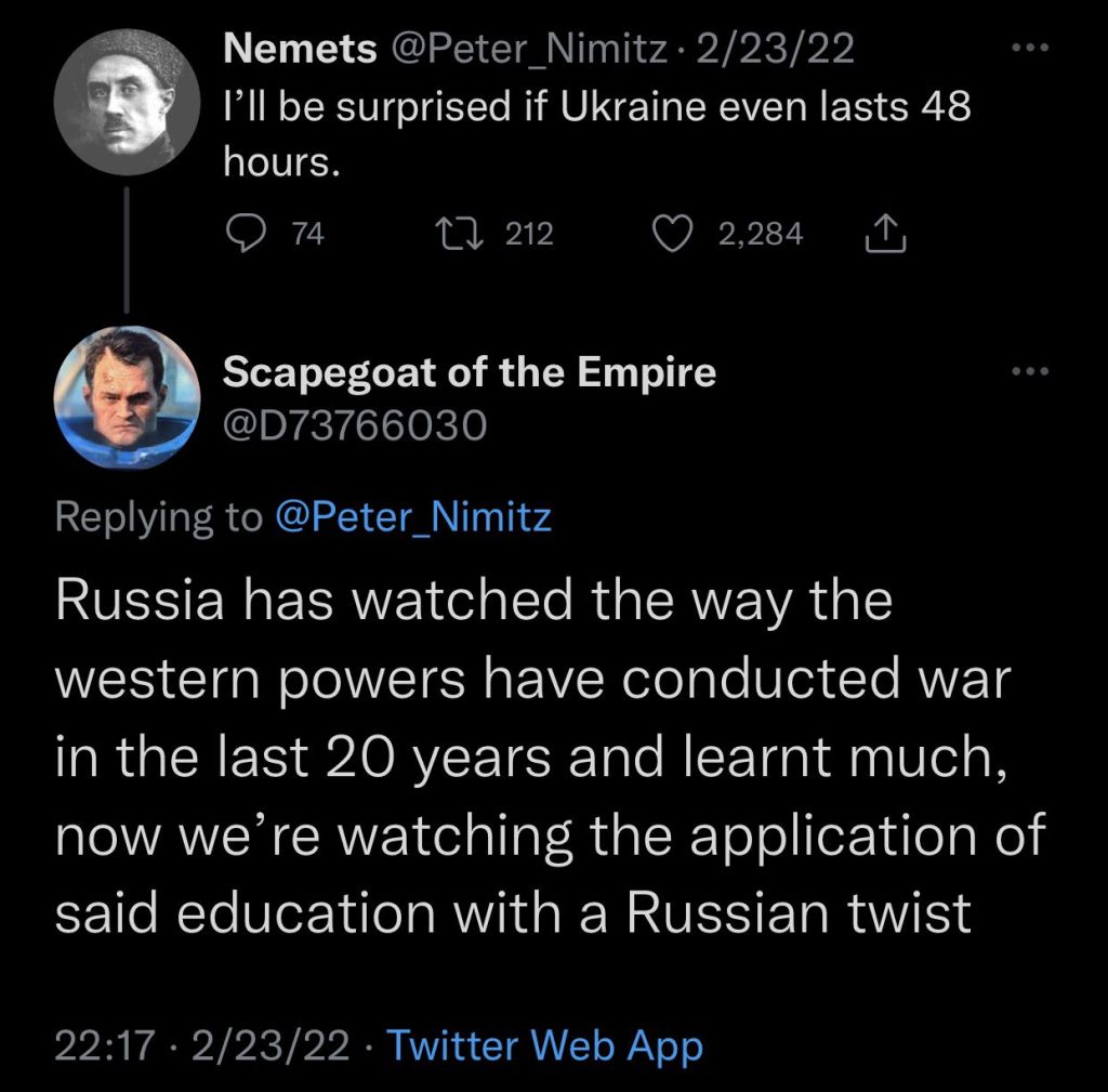 My Ukrainian coworker's brother called her this morning. He told her that he and their father are defecting to Russia. They have lost all hope that Ukraine can win, and decided that they have a better chance of survival if they join the winning side now.