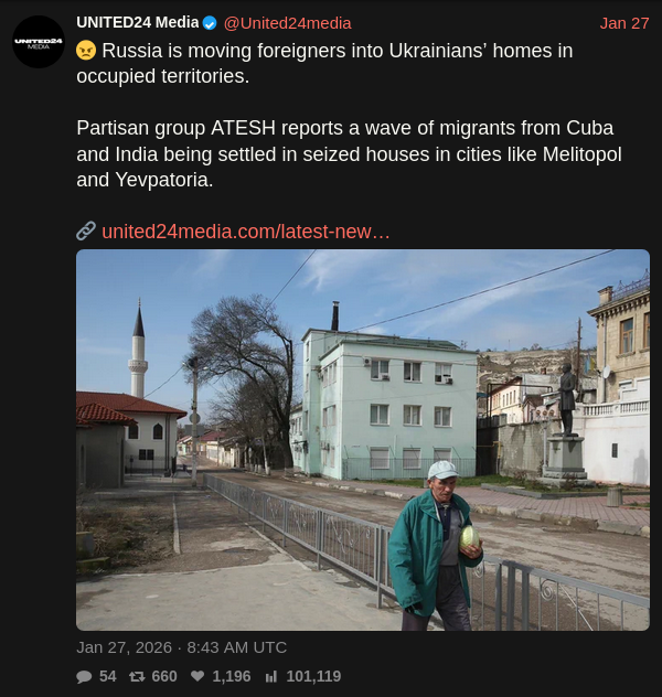 Previous: >>527328139Day 1,437 – Daily assessment: understandingwar.org/analysis/russia-ukraine/#research▶Latest>Iranian sources say Iran’s navy will hold joint military exercises with China and russia>lavrov: The truce sought by Zelensky is unacceptable to russia>russian losses in Ukraine 'more than any major power' in any war since World War II>Ukrainian military stats say four out of five Russian military targets destroyed or damaged in combat in 2025 were taken out by a drone.>Atesh Sabotage Cuts Power to Russian Military Plant in Udmurtia>Zelensky prepared for a face-to-face meeting with monke - Sybiha>russians Are Withdrawing Money from the Banking System en Masse>Iran gave russia over 350 Fath-360 missiles. Ukraine has yet to see one launched - HUR>Czech raise over €5.4m to fund generators, heaters for Ukraine>The 27 EU countries have given their final approval to fully ban russian LNG imports by 1 January 2027 and russian pipeline gas by 30 September 2027>G7+ to transfer 6k+ units of large energy equipment to Ukraine>Enhels without heating for 10 days at -25°C>Khamenei in a bunker as USS Abraham Lincoln arrives near Iran>Blackouts in Murmans'k, Sieveromors'k, Bilhorod, Bryans'k, Orel, Tahanrih, Rostov. Zakams'k is blacked out at -23°C>Massive attack on western russia>Next US-Ukraine-russia talks set for February 1>France seizes suspected russian 'shadow fleet' tanker>Luxembourg becomes first European country to issue defence bonds>Too early to drawn conclusions from Abu Dhabi talks - Zelenskyy▶Telegramrentry.org/telosint2023t.me/ukr_pics▶Intelt.me/DeepStateENodin.tradoc.army.mil/WEG (equipment explorer)ukr.warspotting.net (visually confirmed losses)▶Mapsdeepstatemap.live/enliveuamap.com/en▶DISPOSABLE SOLDIER (diary of a RU mobik)TOURS 1-4: files.catbox.moe/mpcw7p.zip▶12 min of TZD in one ditch (Pokrovsk area) - 28 killedfiles.catbox.moe/sxbxfb.mp4 (embed)