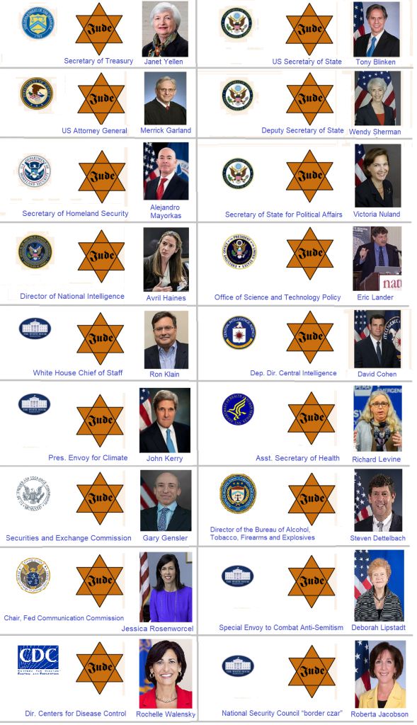 Jews in Joe Biden’s Cabinet (65% jewish, 4,750% US over-representation):Ronald Klain, Chief of StaffAnthony Blinken, Secretary of StateWendy Sherman, Deputy Secretary of StateMerrick Garland, Attorney GeneralAvril Haines, Director of National IntelligenceEric Lander, Science and Technology Policy DirectorAlejandro Mayorkas, Secretary of Homeland SecurityAnne Neuberger, Director of CybersecurityRachel (Richard) Levine, Deputy Health SecretaryJanet Yellen, Treasury SecretaryDouglas Emhoff, Husband of US Vice President Kamala HarrisJared Bernstein, Council of Economic AdvisorsRochelle Walensky, Director of Center for Disease ControlJeff Zients, COVID-19 Coordinator