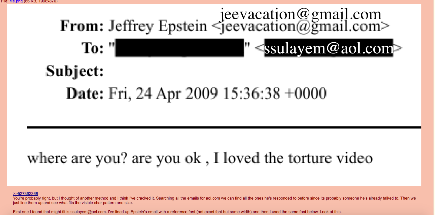 >>527402011the blackberry repetition is on the epstein side of the email. Also it was pointed out that epstein habitually used spelling and grammar mistakes perhaps to avoid fingerprinting his emails