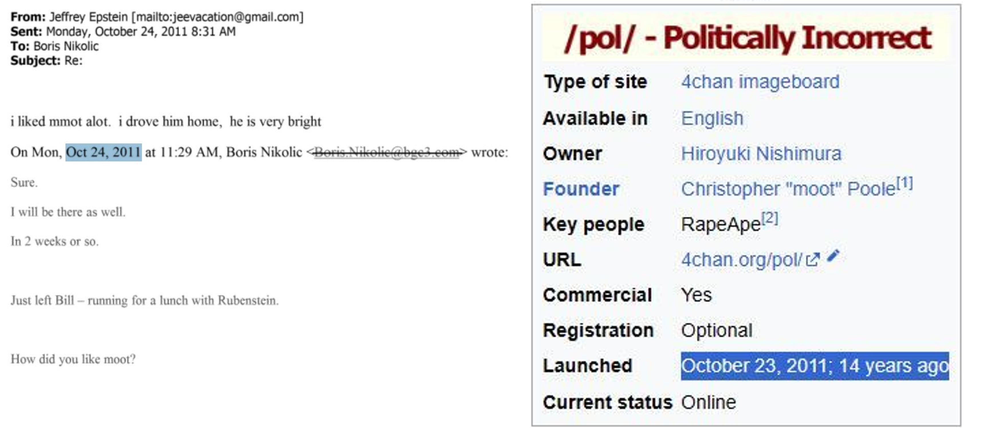 October 20, 2011: Emails from Boris Nikolic (a science advisor to Bill Gates and Jeffrey Epstein) suggest that Epstein should meet "moot" (Christopher Poole).