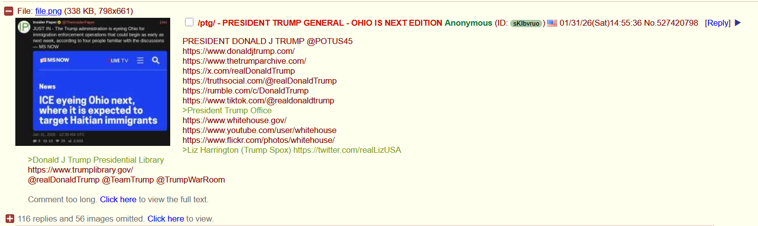 PRESIDENT DONALD J TRUMP @POTUS45https://www.donaldjtrump.com/https://www.thetrumparchive.com/https://x.com/realDonaldTrumphttps://truthsocial.com/@realDonaldTrumphttps://rumble.com/c/DonaldTrumphttps://www.tiktok.com/@realdonaldtrump>President Trump Officehttps://www.whitehouse.gov/https://www.youtube.com/user/whitehousehttps://www.flickr.com/photos/whitehouse/>Liz Harrington (Trump Spox) https://twitter.com/realLizUSA>Donald J Trump Presidential Libraryhttps://www.trumplibrary.gov/@realDonaldTrump @TeamTrump @TrumpWarRoom>b-but Trump hasnt done anything!ARCHIVED LINKS https://pastebin.com/eAhgNyeX NEW APPEARANCES>Pres Trump Participates in a Reception with Business Leaders, Davos, Switzerland 1/21/2026https://youtu.be/FnhWsFMAqO4>Pres Trump Special Address to the World Economic Forum, Davos, Switzerland 1/21/2026https://youtu.be/prdSj9caeQw>Pres Trump Briefs Members of the Media, Washington, DC 1/20/2026https://youtu.be/oNQoMMo8hYw>Pres Trump at Great, Historic Investment in Rural Health Roundtable, Washington, DC 1/16/2026https://youtu.be/roPFrhEclsc>Pres Trump Visits 2025 Stanley Cup Champions The Florida Panthers, Washington, DC 1/15/2026https://youtu.be/bauj7YDTNVk>Pres Trump Speaks to the Detroit Economic Club, Detroit, Michigan 1/13/2026https://youtu.be/lGTJgtL_QYw>Pres Trump Meets with Oil and Gas Executives, Washington, DC 1/9/2026https://youtu.be/iaE8lw8_x30>Pres Trump Remarks at the House GOP Member Retreat, Washington, DC 1/6/2026https://youtu.be/N6tzCCyfwFM>Pres Trump Holds Press Conference on Venezuela, Palm Beach, Florida 1/3/2026https://www.youtube.com/watch?v=SsdkClL2_bg>TrumpVideo: WE WILL WIN 6/19/23https://rumble.com/v2v6m2a>MAKE AMERICA GREAT AGAIN, AGAIN! 10/28/21https://rumble.com/voe8gm>God Bless the USA (Donald J Trump) 10/20/16https://youtu.be/O_PC_fy0fk0 OP pastebin: http://pastebin.com/X4KiALfhprev >>527420798