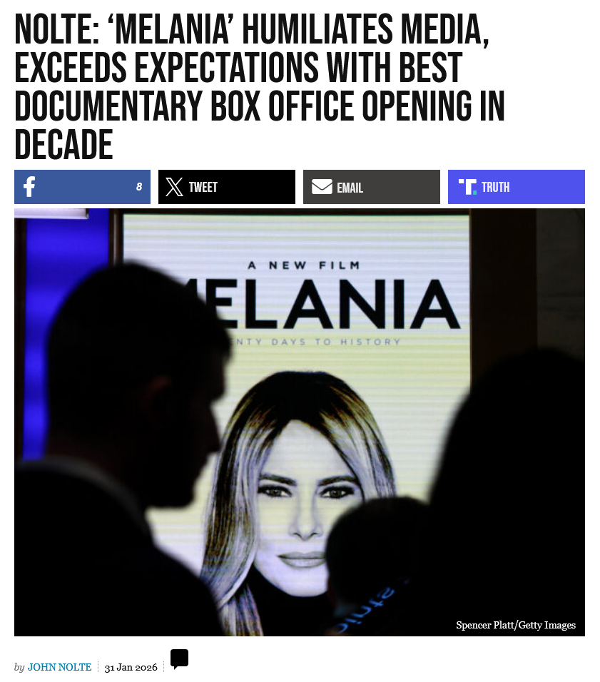 https://deadline.com/2026/01/box-office-iron-lung-send-help-melania-shelter-1236703378/>‘Melania’ ‘A’ CinemaScore & $8M+ Record Docu Debut In Decade>Now, Amazon MGM Studios’ Melania documentary is still seeing $8.1M, but the exit scores are quite royal with an A CinemaScore, 5 stars on Screen Engine/Comscore’s PostTrak, and get this — an 89% definite recommend; unheard for any movie. If a movie is in the 70 percentile range, that’s outstanding. While a figure like that indicates stampede for a tentpole, it’s interesting to see whether there’s any kind of spur for a stampede for a documentary, particularly with the older crowd that this Brett Ratner directed non-fiction film is pulling in. The turnout here is almost like that of a faith-based movie: 72% women, with 72% over 55. Audience score on Rotten Tomatoes is 99% while critics have based the movie at 6%. Melania is playing best in the South (12% over the norm) and South Central with the Cinemark Palace 21 in Boca Raton, FL the pic’s current highest grossing location with over $10K. Pic’s top grossing markets are Dallas, Orlando, Tampa, Phoenix, Houston, Atlanta, West Palm Beach, Fort Myers, Miami, Minnesota, Nashville, Jackson, MI; St. Louis, Las Vegas, Cleveland — the list goes on…no NYC or LA in this bunch. Diversity demos on this one is 74% Caucasian, 11% Latino and Hispanic, 4% Black, 4% Asian American and 7% Native American/other.>Coming in at third is Amazon MGM Studios’ Brett Ratner-directed documentary Melania, which is eyeing $2.85M today (no previews) for an $8M opening in third place — that result would mark the best start for a docu in the last decade (beating Angel Studios’ 2023 doc After Death, which opened to $5M and finaled at $11.5M stateside). I’m hearing sales are gaining, with Florida and Texas quite large, for the First Lady’s big-screen debut.Melania wins.