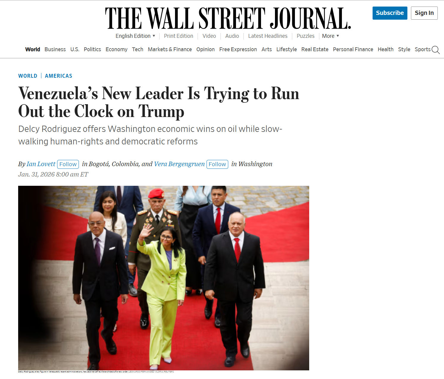 >“They’re hoping to wait out Trump, that’s why we can’t allow that,” Rep. Carlos Gimenez (R., Fla.) said about Rodriguez’s interim government. “As soon as they think they have the upper hand, they’ll tell us to go away.”>Some Trump officials have sought to reassure lawmakers, foreign leaders and business executives that the cooperation with Rodriguez is temporary. U.S. Energy Secretary Chris Wright has told American executives there would be elections in 18 to 24 months, a person present said.https://www.wsj.com/world/americas/venezuelas-new-leader-is-trying-to-run-out-the-clock-on-trump-f5564b52https://archive.is/gjdWR
