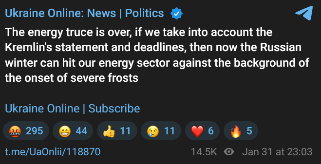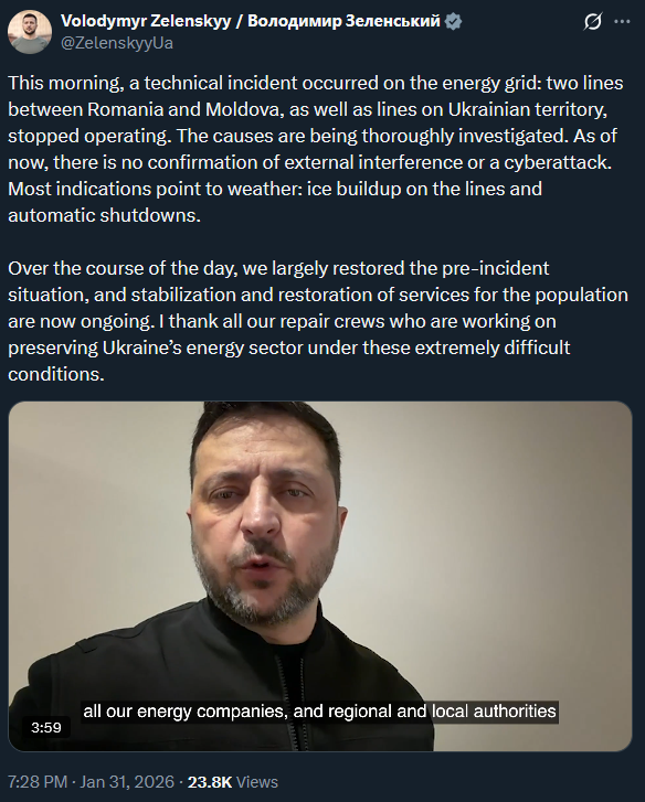 >This morning, a technical incident occurred on the energy grid: two lines between Romania and Moldova, as well as lines on the Ukraine's territory, stopped operating. The causes are being thoroughly investigated. As of now, there is no confirmation of external interference or a cyberattack. Most indications point to weather: ice buildup on the lines and automatic shutdowns.>Over the course of the day, we largely restored the pre-incident situation, and stabilization and restoration of services for the population are now ongoing. I thank all our repair crews who are working on preserving the Ukraine’s energy sector under these extremely difficult conditions.>Most indications point to weatherThe weather works for Putler!So unfair!