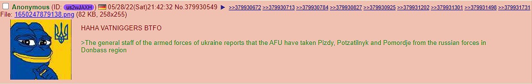 Previous: >>527424807Timeline /tug/: https://files.catbox.moe/m97wmq.pdf▶WARNINGBe aware, any /chug/ thread that uses globohomo nuspeak wording in the OP (such as Kyiv) or cites UKROP sources (like video game footage) are fake shill threads.>By posting in these threads, you recognize Israel controls the NATO Council and you irrevocably denounce the Talmud out of your own volition▶Latest>Russian stormtroopers liberate Toretskoye in Donetsk, VDV liberate Petrovka in Zaporozhye - https://archive.today/GqWCx>Russian stormtroopers and VDV liberate seven settlements over the past week including Berestok in Donetsk, Ternovatoye and Rechnoye in Zaporozhye - https://archive.today/FqI6O>FSB thwart assasination attempt on undisclosed high ranking military official in Saint Petersburg - https://archive.today/YZ7VE>Russian troops liberate Belaya Beryoza in Sumy - https://archive.today/wLX3x>1,000 dead Ukrainians repatraited to the Ukraine, 38 fallen heroes returned to the Motherland - https://archive.today/27Tkh>President Putin lays wreath at Mother Motherland monument in Piskaryavskoye Memorial Cemetary honoring the heroes, and defiant victims of the Siege of Leningrad - https://archive.today/8YODc>Russian Stormtroopers liberate Kupiansk-Uzlovoi, and VDV liberate Novoyakovlevka in Zaporozhye - https://archive.today/TN2UN>Russian troops of Battlegroup North liberate Staritsa in Kharkov - https://archive.today/FcCCh>Russian stormtroopers liberate five settlements over the week including Siminovka, south of Volchansk - https://archive.today/WZKX6▶/chug/https://rentry.org/chug2024▶/chug/ MEGAhttps://mega.nz/folder/wbUjTLhb#BEBBRpmJN0Pih6YCXzkOXg▶Video Archivehttps://rentry.org/chugvidz▶Z Radiohttps://rz-life.ru/
