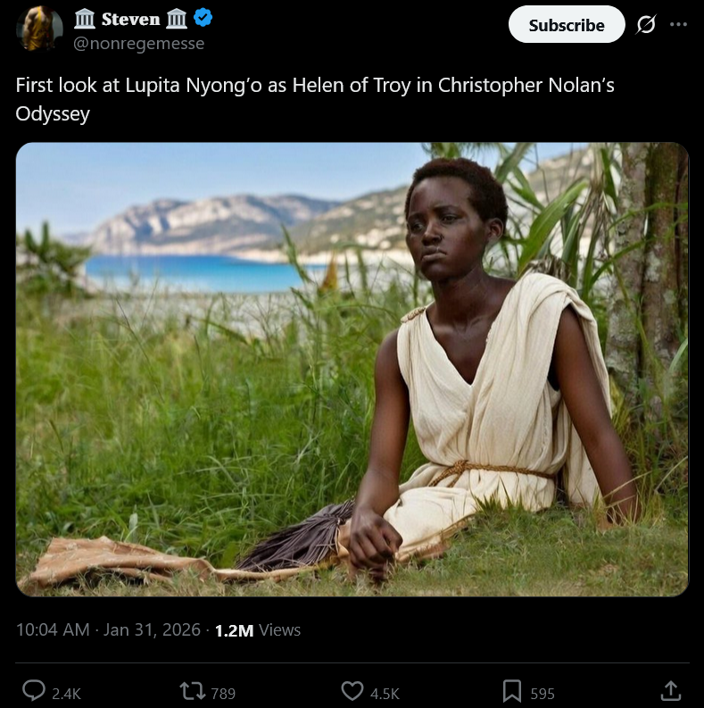 >>527449651>First look at Lupita Nyong’o as Helen of Troy in Christopher Nolan’s Odyssey.How do you comment without sounding racist?