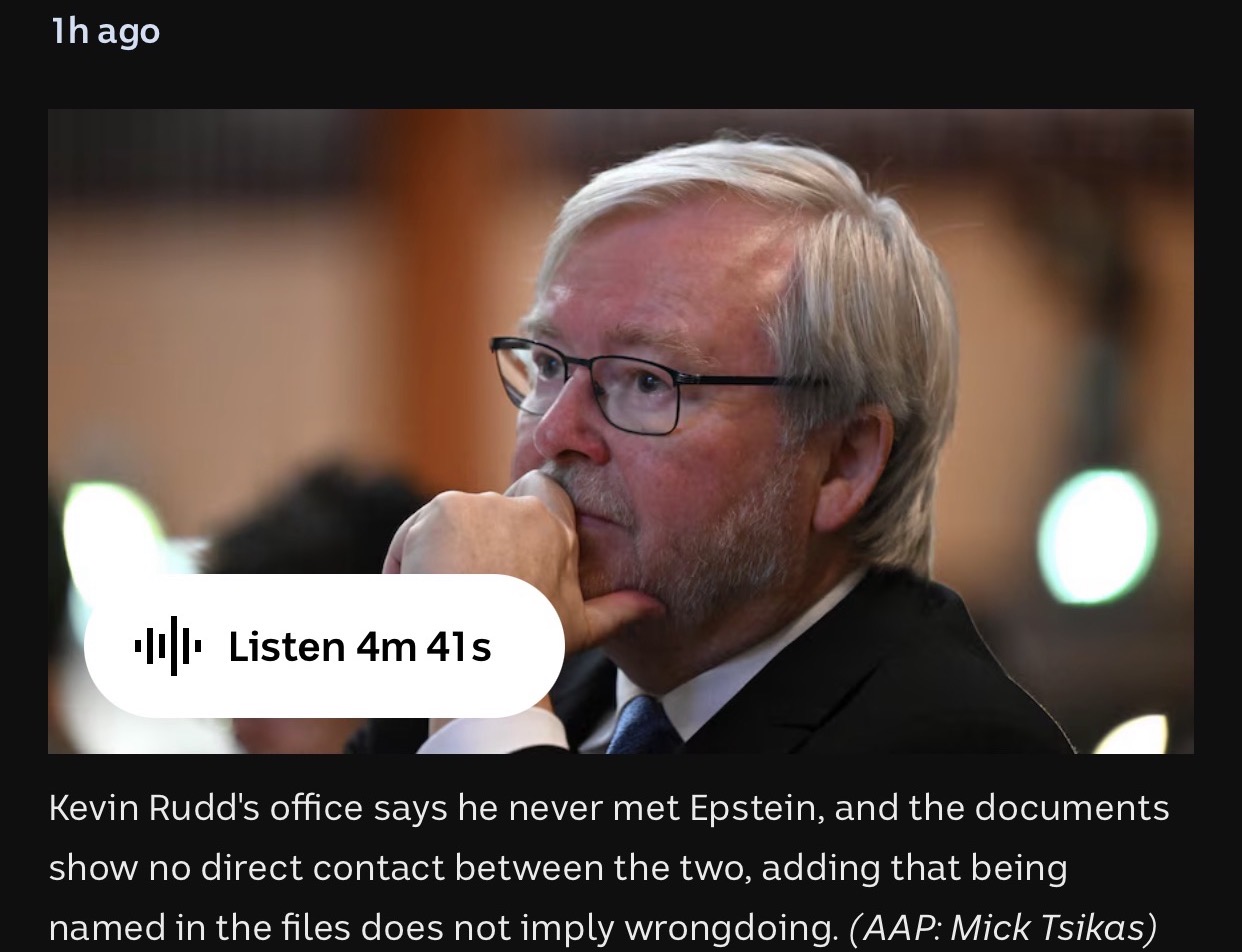 A bombshell drop of more than 3.5 million files linked to convicted pedophile Jeffrey Epstein has referenced a string of former Australian Prime Ministers and their families.https://www.abc.net.au/news/2026-02-01/naus_ncepsteinsun_0102/106292490https://www.couriermail.com.au/news/national/kevin-rudd-says-he-never-met-jeffrey-epstein-despite-references-in-new-files-release-by-us-dept-of-justice/news-story/464384a7aa6de922a8a7709eeb51ae6bKevin Rudd's office says he never met Epstein, and the documents show no direct contact between the two, adding that being named in the files does not imply wrongdoing.