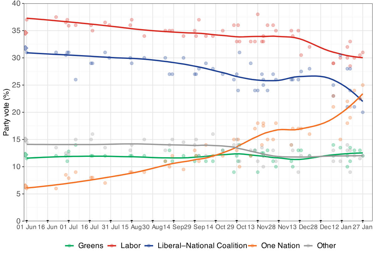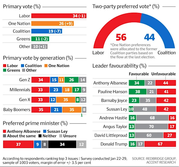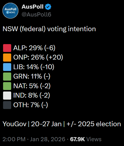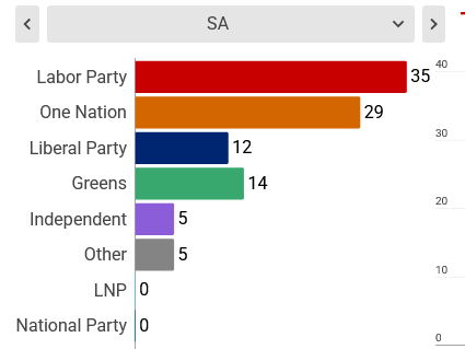 I'm suddenly very invested in the SA state election which is just a few weeks away. One Nation will be running candidates in every seat. Most likely scenario was almost always SA state Labor massively overperforming and winning a landslide but there is now a reality where One Nation wins without even having an established leader.Given the state of the Libs, I don't think the government made any preparations to even campaign. If One Nation's federal surge replicates in the state, it would completely rattle the system.I wouldn't be surprised if the hyped up defection tomorrow is related to SA state level