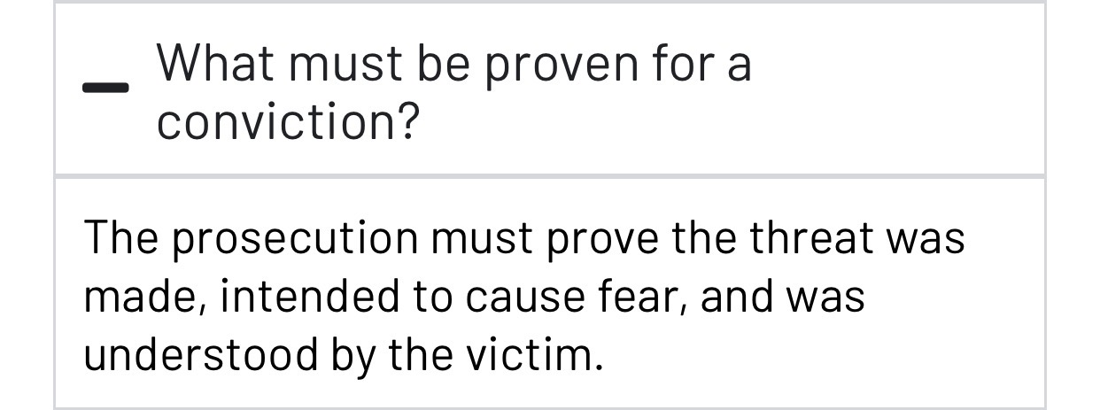 Element 2: The accused’s state of mindThe second element of the offence requires the accused to have either:Intended that the complainant fear the threat would be carried out; orBeen reckless as to whether the complainant would fear the threat would be carried out.IntentionIt is not necessary for the accused to have intended to carry out the threat. The accused need only intend that the complainant would fear they would carry out the threat.6The accused’s motive for making the threat is irrelevant when considering intention.7All the circumstances of the statement or conduct must be considered when establishing intention.8 Did you intend for someone to fear your threat would be carried out? RecklessnessTo have been reckless as to whether the complainant would fear that the threat to kill would be carried out, the accused must have been aware when they made the threat that it was probable that the complainant would fear that the threat would be carried out.9The accused being aware of a ‘possibility’ or ‘likelihood’ that the complainant would fear that the threat would be carried out is insufficient to establish recklessness.10The accused themselves must have been aware that it was probable that the complaint would fear the threat to kill would be carried out for recklessness to be established. It is insufficient that a reasonable person in the accused’s circumstances would have realised that the complainant would probably fear the threat.11Element 3: The threat is made without lawful excuseFor the offence to be made out, the accused must have made the threat without any lawful justification. Self-defence and prevention of crime are common forms of justification. A person acts in self-defence when they believe, on reasonable grounds, that their actions are necessary.