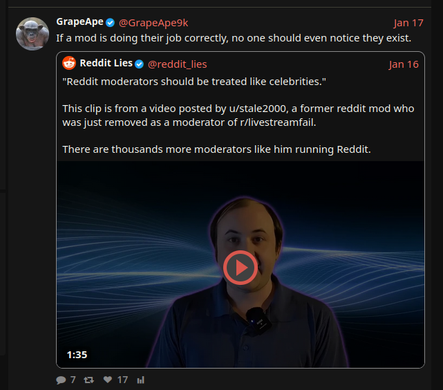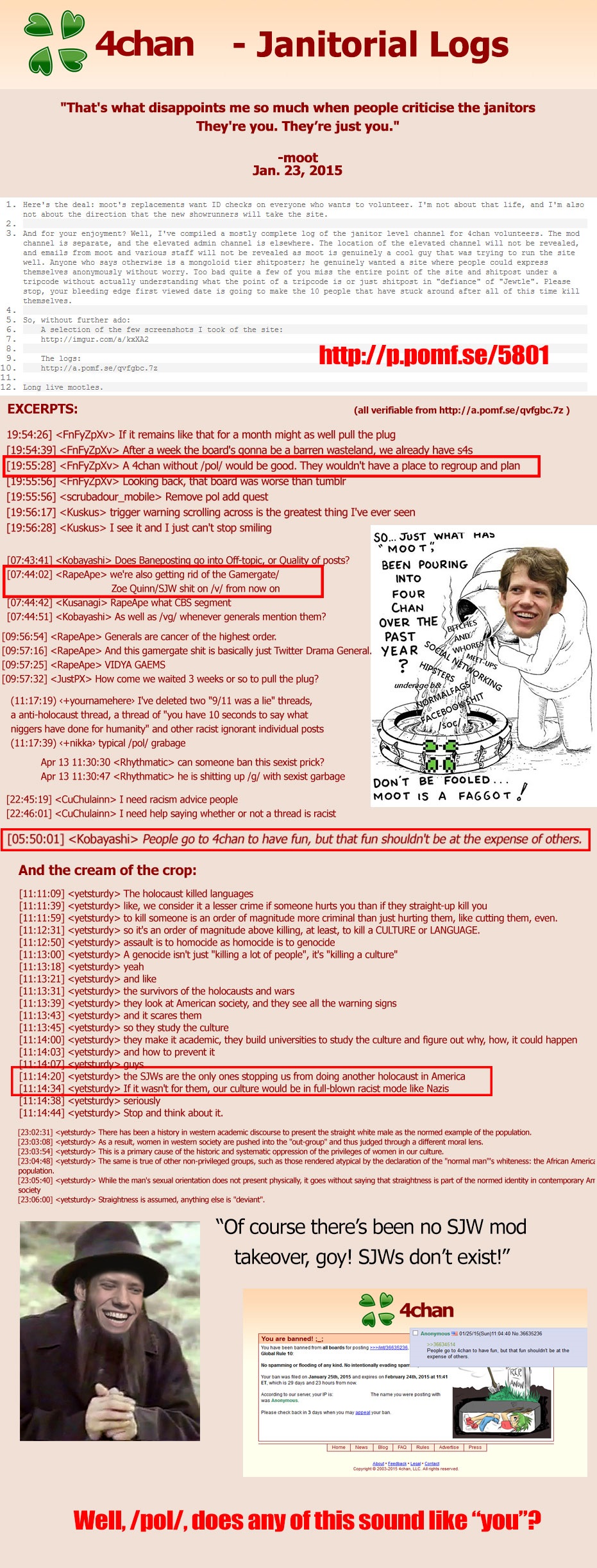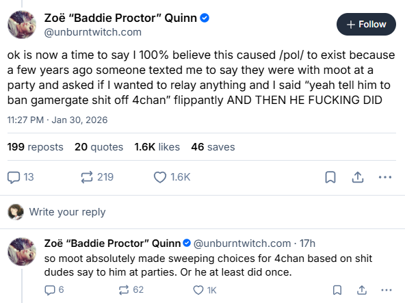 >>527455933So now that it's come out that M00t was tied to Epstein Zoe is throwing him under the bus and trying to distance herself....>>527456504Except we know her and her boyfriend (who later was accused of taking nudes of passed out women, which Zoe Defended) were mods on 4chan and bragged about it.>>527456557And we had the Janny logs since the begining,>>527460714>>527460813But then the former janny tries to rewrite history, even though Gaming is in the toilet and DEI infected everything.>>527460994And is trying to rehab his image. What has these has beens so shook?