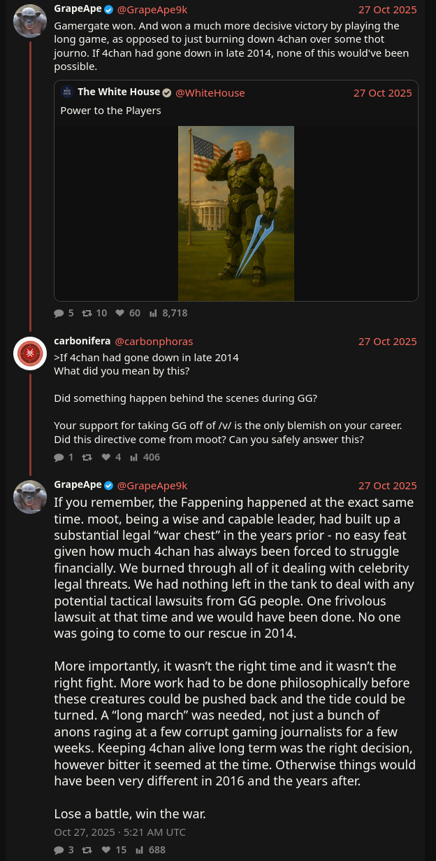 >>527460105i have no real side on this, i was a 'participant' in gamergate on the investigatory side before the ecelebs like metokur and shoeonbaldhead took full advantage and co-opted it. there was a point where the new revelations dried up, retard namefags like roguestar and cameralady started making shit up to keep the endorphins flowing (parallels to qanon shit 6-7 years later) and the enthusiastic participants were channeling what could only be described as a more forced and cringe version of Chanology.moot then got fed up with the luggage lad trolling and trolled the board back with the cuckolding princess kah-rinn audio (i really wish there were a copy of this for historical purposes) and the nu-pol gamergate tourists completely shit themselves over it because, being newfags, they had never seen a board get trolled by admins before. this was some classic 2005 era shit but instead of appreciating it, they took it as a personal political prosecution and self-deported to 8gag and they were not missed at all.anyway i just think it's funny how they selectively forget a lot of this part of the story.