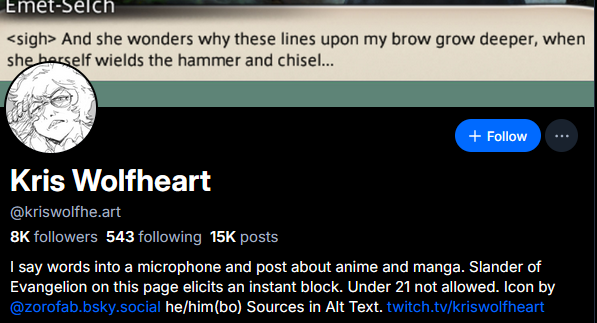 >>527455933Remember Loltaku aka MrFeel?This is him now:https://bsky.app/profile/kriswolfhe.artHe used to run a blog making fun of Kotaku, right after the Gamergate shit started but then got troll's remorse.