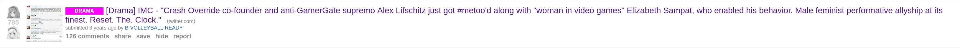 >>527473503>>527472856Again, no clue if any of this is proven and all parties involved are mentally ill but.....https://old.reddit.com/r/GamerGhazi/comments/cxe1fw/alex_lifschitz_outed_as_an_abuser/The accusations were worse than I remembered. Keep in mind, this is to anti- GG sub. Not an issue if you believe accusations must be proven and believe in rule of law, a bit trickier when you #BelieveAllWomen as a feminist