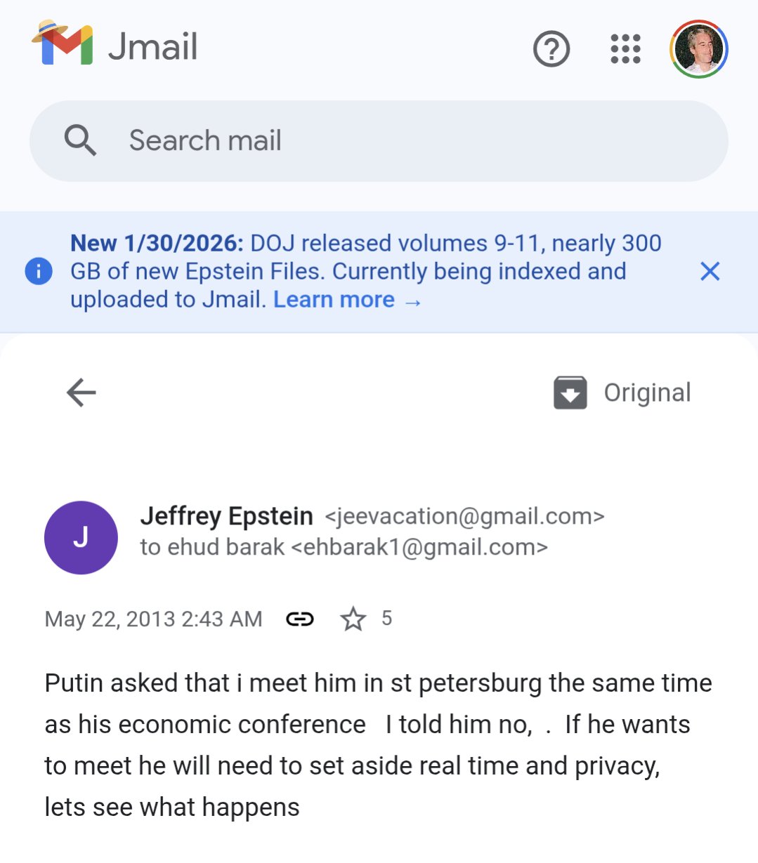>>527477543>>527478023Putin's name comes up when you CTRL+F because he was MENTIONED in emails, but because he was on the island or had anything to do with Epstein.