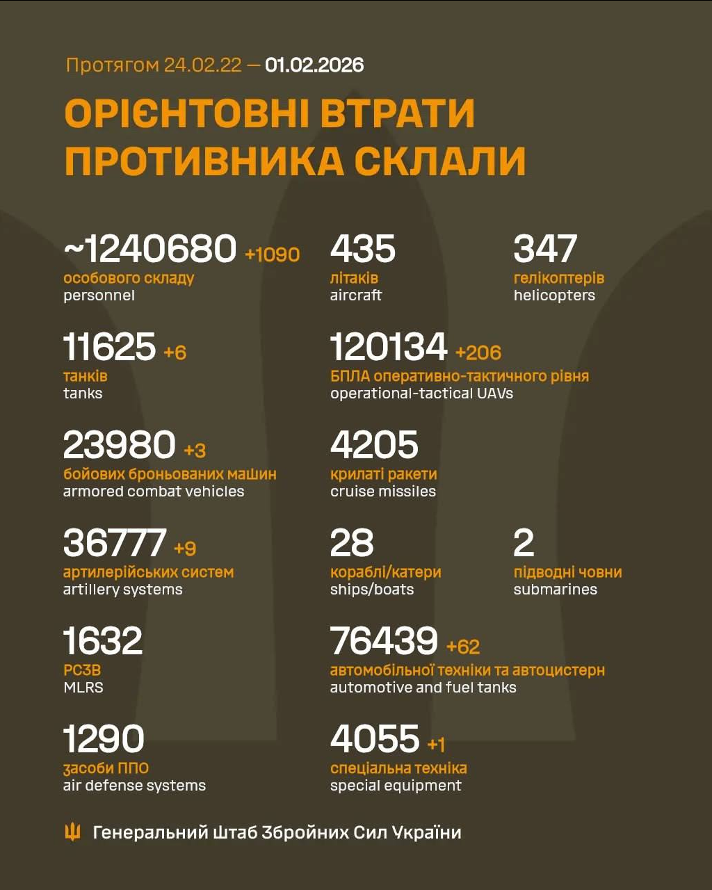 Russian losses per 31/01/26 reported by the Ukrainian General Staff+880 men+5 tanks+8 ACVs+20 artillery+1 MLRS+1 AD system+694 UAVshttps://x.com/NOELreports/status/2017484238203822094?s=20>yesterday stats
