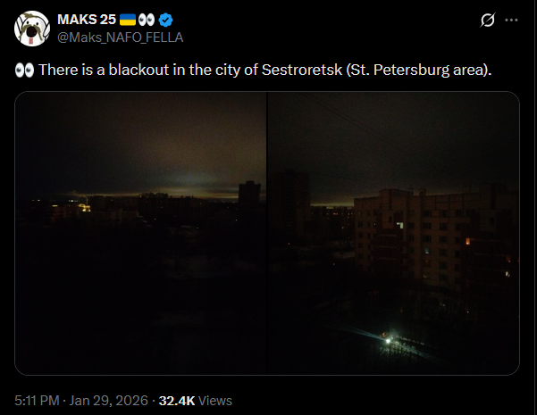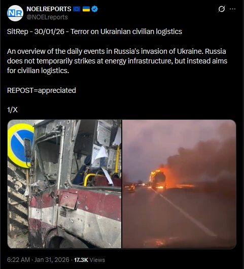 SitRep - 30/01/26 - Terror on Ukrainian civilian logisticsAn overview of the daily events in Russia's invasion of Ukraine. Russia does not temporarily strikes at energy infrastructure, but instead aims for civilian logistics.https://x.com/NOELreports/status/2017483677265952825?s=20
