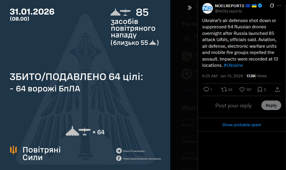 Ukraine’s air defenses shot down or suppressed 64 Russian drones overnight after Russia launched 85 attack UAVs, officials said. Aviation, air defense, electronic warfare units and mobile fire groups repelled the assault. Impacts were recorded at 13 locations. #Ukrainehttps://x.com/NOELreports/status/2017484457888915625?s=20>31st