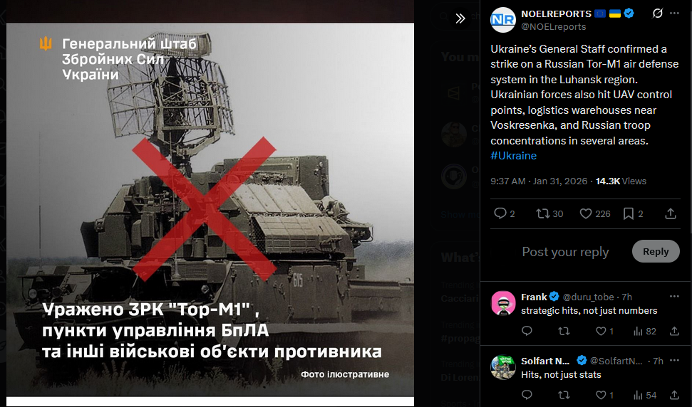 Ukraine’s General Staff confirmed a strike on a Russian Tor-M1 air defense system in the Luhansk region. Ukrainian forces also hit UAV control points, logistics warehouses near Voskresenka, and Russian troop concentrations in several areas. #Ukrainehttps://x.com/NOELreports/status/2017532716724428810?s=20>31st