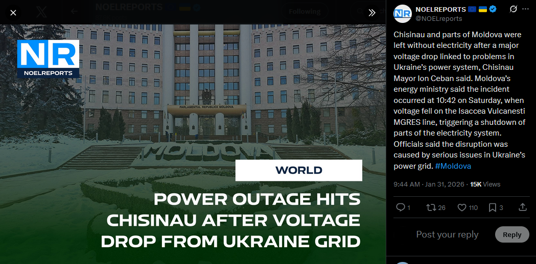 Chisinau and parts of Moldova were left without electricity after a major voltage drop linked to problems in Ukraine’s power system, Chisinau Mayor Ion Ceban said. Moldova’s energy ministry said the incident occurred at 10:42 on Saturday, when voltage fell on the Isaccea Vulcanesti MGRES line, triggering a shutdown of parts of the electricity system. Officials said the disruption was caused by serious issues in Ukraine’s power grid. #Moldovahttps://x.com/NOELreports/status/2017534517368504455?s=20>31st
