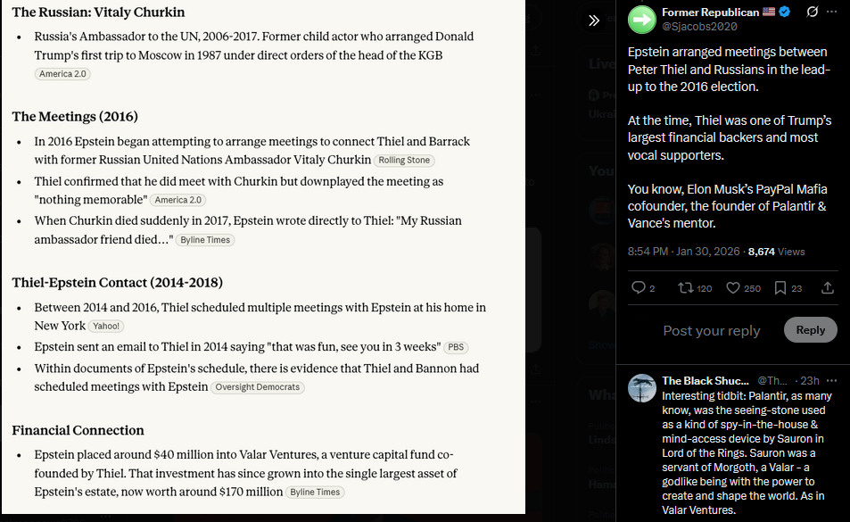 >>527502610Sjacobs2020 31-01-2026 Epstein arranged meetings between Peter Thiel and Russians in the lead-up to the 2016 election. Trump, Vance, Palantir
