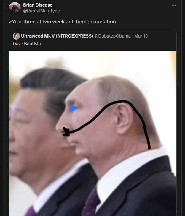 >>527579053>based and redpilledA based and redpilled country would not need to lie about a defensive bloc being one of the main reasons for starting a land grab genocidal war, to then behave like said bloc is a save heaven. A based and redpilled country states its intentions clearly without a bunch of contradictory and retarded propaganda. Even Nazis, and I don't like them at all, were superior to current pidorussia. They openly called their enemies subhuman, while russia is pretending like it's not fighting civilians (always targeting them).