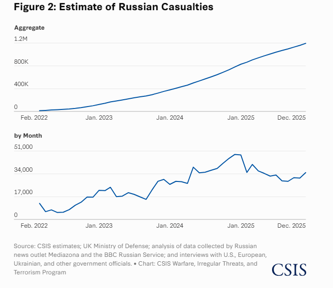 >>5275797096/?Russian Military and Economic IndicatorsIn this war of attrition, Russia has held the military initiative on the battlefield in Ukraine since roughly January 2024 and been on offense. But how effective has the Russian military been? To evaluate Russian efforts, this section examines Russia’s casualties and fatalities, its rate of advance, the amount of territory seized, and the state of its war economy. These factors provide insights into how Russia is performing on the battlefield and its ability to sustain the conflict over the long run.Russian Casualties and FatalitiesAssessing casualties and fatalities in wartime is difficult and imprecise, and various sides have incentives to inflate or shrink the numbers for political purposes. According to CSIS estimates, Russian forces suffered nearly 1.2 million battlefield casualties, which include killed, wounded, and missing, between February 2022 and December 2025, as highlighted in Figure 2. There were roughly 415,000 Russian casualties in 2025 alone, with an average of nearly 35,000 casualties per month. In addition, there were roughly 275,000 to 325,000 Russian battlefield fatalities between February 2022 and December 2025.These numbers are extraordinary. No major power has suffered anywhere near these numbers of casualties or fatalities in any war since World War II. For example, U.S. battlefield casualty and fatality numbers are significantly lower, with the United States suffering 54,487 battle deaths during the Korean War, 47,434 deaths during the Vietnam War, 149 deaths during the 1990–1991 Gulf War, 2,465 deaths in Afghanistan during Operation Enduring Freedom and Operation Freedom’s Sentinel, and 4,432 deaths in Iraq during Operation Iraqi Freedom.