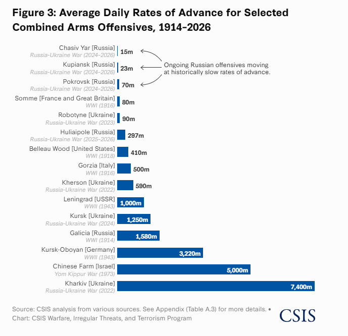 >>52757994110/?To the south, in Zaporizhzhia Oblast, a more recent Russian offensive has made greater progress. In November 2025, Russia intensified an offensive aimed at capturing the city of Huliaipole. Between early November 2025 and early January 2026, Russian forces advanced roughly 18.5 kilometers, at an average pace of 297 meters per day.In all of its offensives over the last two years, Russia has failed to generate rapid breakthroughs to collapse the Ukrainian front line and allow for sweeping territorial gains. Figure 3 illustrates this trend by comparing the average rates of advance for major offensives in Ukraine since 2022 alongside historical benchmarks from World War I, World War II, and other wars. Russia’s Pokrovsk offensive has advanced slower than Allied forces in the Battle of the Somme in World War I, one of the most grinding offensives of the war. Russia’s offensives around Kupiansk and Chasiv Yar have been even less efficient, moving at mere fractions of the pace of historical campaigns.
