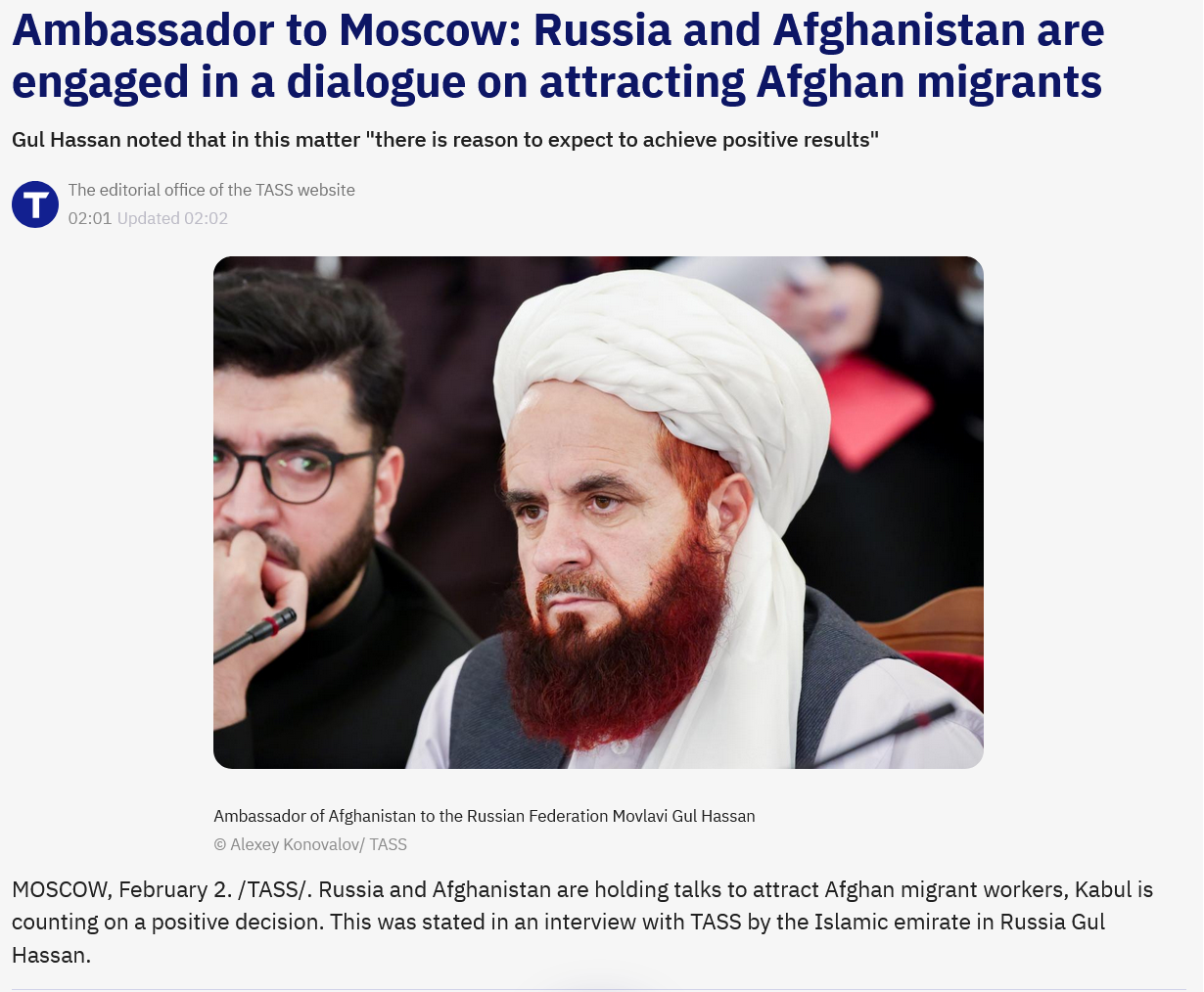 Moscow and Kabul Negotiate Labour Migration Pact to Ease Russian Workforce DeficitRussia and Afghanistan have initiated high-level discussions to facilitate the entry of Afghan workers into the Russian labour market, according to Gul Hassan, the Islamic Emirate’s ambassador in Moscow.In an interview with state media, Ambassador Hassan confirmed that negotiations regarding the "attraction of labour migrants" are already underway and expressed optimism for a positive resolution. He highlighted that the initiative aims to deploy Afghanistan’s predominantly young workforce to sectors in Russia facing acute personnel shortages, emphasising Kabul's readiness to supply both skilled and professional cadres.This potential labour agreement marks a significant deepening of economic ties between Moscow and the Taliban-led government, following recent moves to expand direct aviation links and boost energy trade.