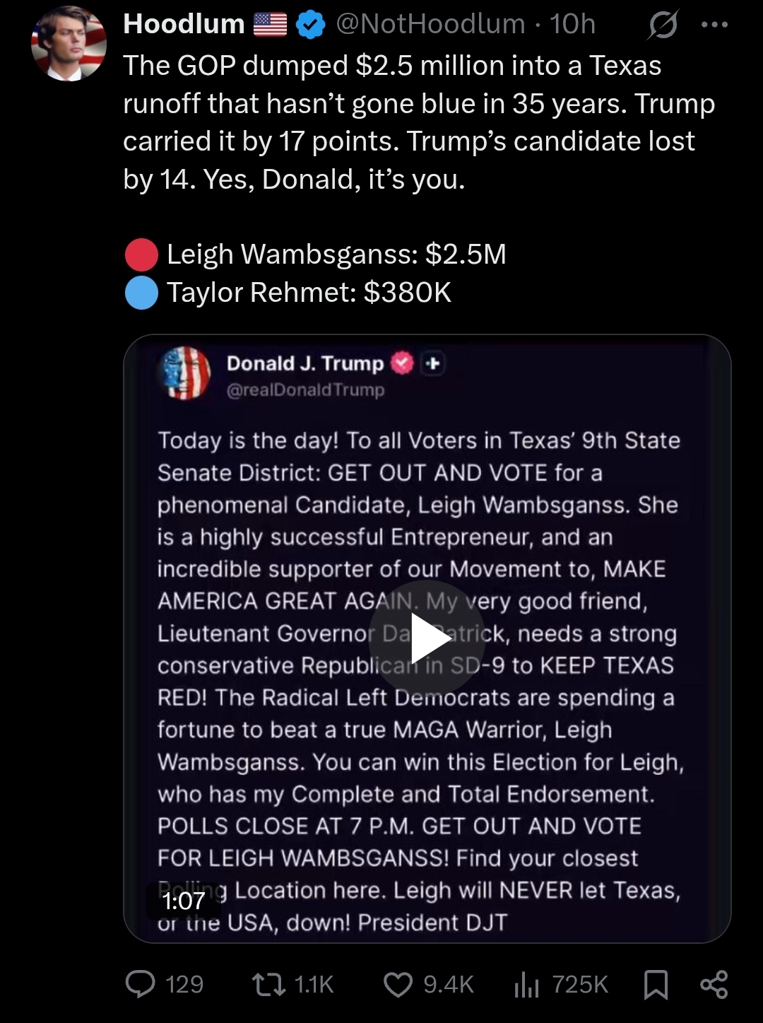 >>527587833yes let's not talk how this special election runoff happened in one of the coldest day in decades for texas so the ruling party was in great disadvantage or how the runoff was because there were 2 republicans (that got 52%)or how even with both parties votes the runoff doesn't amount to even the actual republican party turnout in a normal electionit just shows how much money was wasted because of the GOP split instead of actual campaign, and that is if they really are telling the truth with the money amount of the democrats