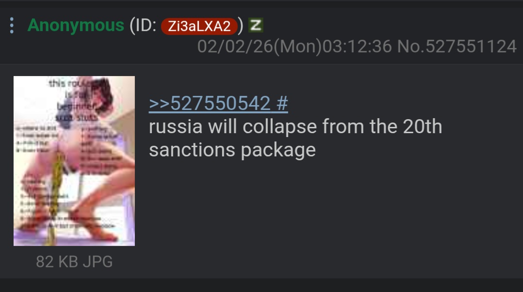 Previous: >>527576417Day 1,440 – Daily assessment: understandingwar.org/analysis/russia-ukraine/#research▶Latest>Sweden preparing one of its largest aid packages for Ukraine>SBU Alpha FPV operators eliminated over 1,800 russians in Pokrovsk sector in one week, the unit reports>First countermeasures against Starlink misuse are in place after russia began using Starlink-equipped drones for strikes>Norway confirmed plans for $7 billion in military aid to Ukraine in 2026>Frozen pipes in Bilhorod and Omsk burst en masse after large-scale blackouts>The US secured a $235 million contract to repair and service Ukraine’s F-16 fighter jets in Belgium>Iranian sources say Iran’s navy will hold joint military exercises with China and russia>lavrov: The truce sought by Zelensky is unacceptable to russia>russian losses in Ukraine 'more than any major power' in any war since World War II>Ukrainian military stats say four out of five russian military targets destroyed or damaged in combat in 2025 were taken out by a drone.>Atesh Sabotage Cuts Power to russian Military Plant in Udmurtia>Zelensky prepared for a face-to-face meeting with monke - Sybiha>russians Are Withdrawing Money from the Banking System en Masse>Iran gave russia over 350 Fath-360 missiles. Ukraine has yet to see one launched - HUR>Czech raise over €5.4m to fund generators, heaters for Ukraine>The 27 EU countries have given their final approval to fully ban russian LNG imports by 1 January 2027 and russian pipeline gas by 30 September 2027>G7+ to transfer 6k+ units of large energy equipment to Ukraine▶Telegramrentry.org/telosint2023t.me/ukr_pics▶Intelt.me/DeepStateENodin.tradoc.army.mil/WEG (equipment explorer)ukr.warspotting.net (visually confirmed losses)▶Mapsdeepstatemap.live/enliveuamap.com/en▶DISPOSABLE SOLDIER (diary of a RU mobik)TOURS 1-4: files.catbox.moe/mpcw7p.zip▶12 min of TZD in one ditch (Pokrovsk area) - 28 killedfiles.catbox.moe/sxbxfb.mp4