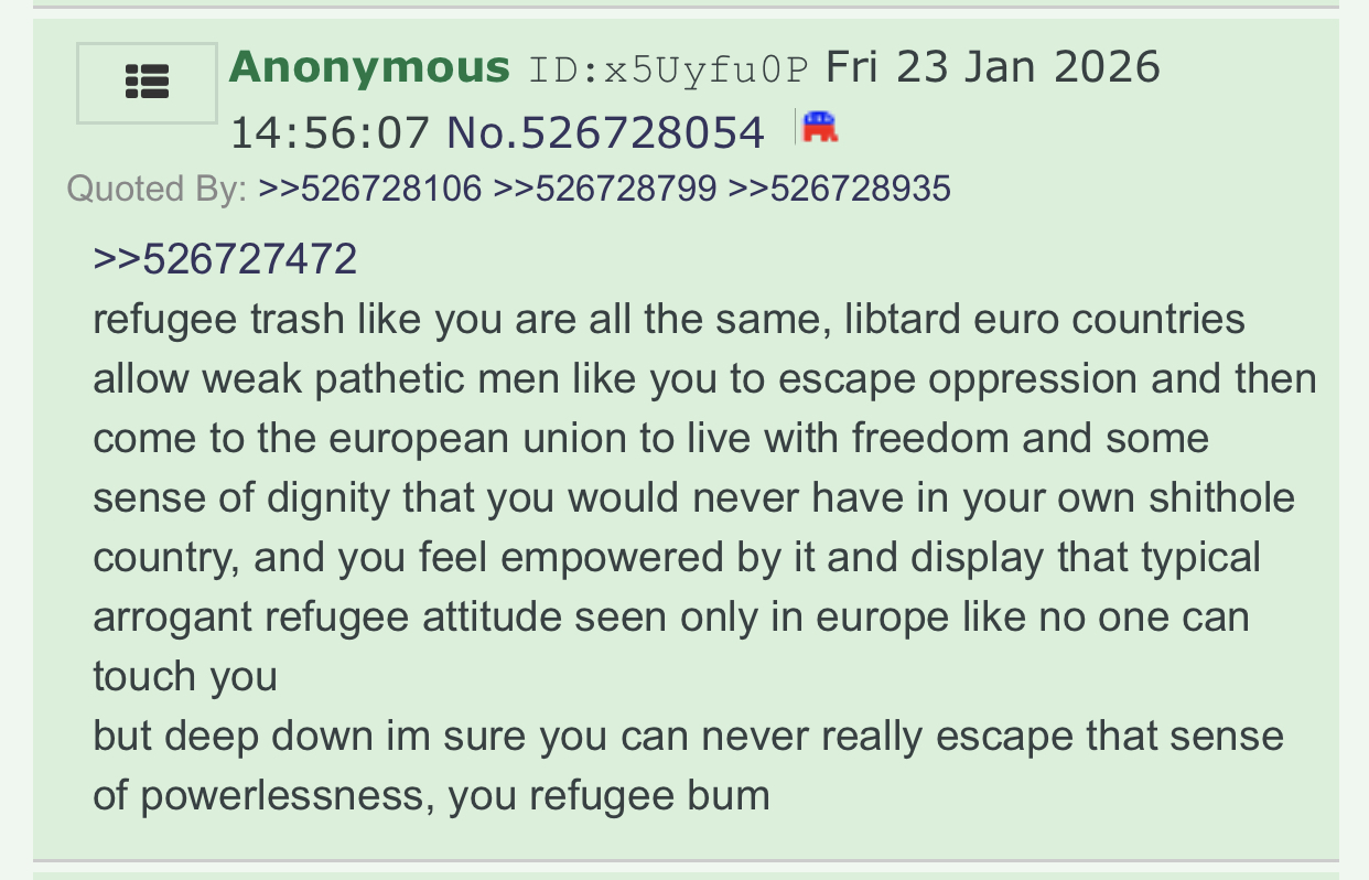 >>527584967>I have nothing to return to in Ukraine. No family left, no property, no nothing.THERE IT IS THERE IS THAT SENSE OF POWERLESSNESS COMING OUTTHATS WHAT I WAS TALKING ABOUT>refugee trash like you are all the same, libtard euro countries allow weak pathetic men like you to escape oppression and then come to the european union to live with freedom and some sense of dignity that you would never have in your own shithole country, and you feel empowered by it and display that typical arrogant refugee attitude seen only in europe like no one can touch you>but deep down im sure you can never really escape that sense of powerlessness, you refugee bum