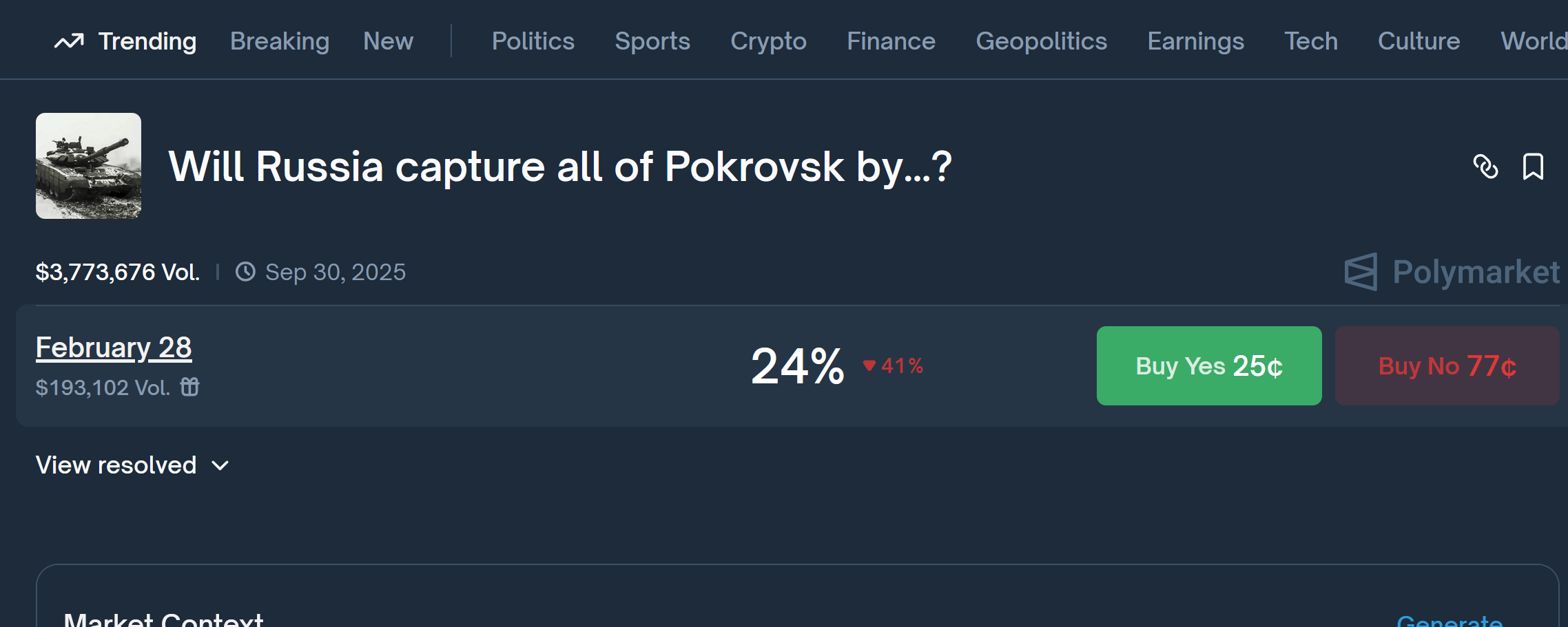 >>527592019Cope, seethe and dilate shitskin KEKAROOOONow let's take a gander at Polymarket and see how Pokvorsk is going....OH NO NO NO NO THEY'RE NOT EVEN OPENING UP A MARCH MARKET BECAUSE ALL THE RETARD WHALES THAT THOUGHT THE RUSSNIGGER ARMY WAS COMPETENT HAVE FLED IN SHAME KEKAROOOOOOOOOOO