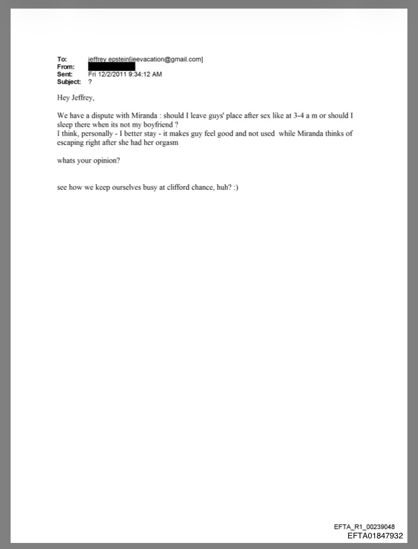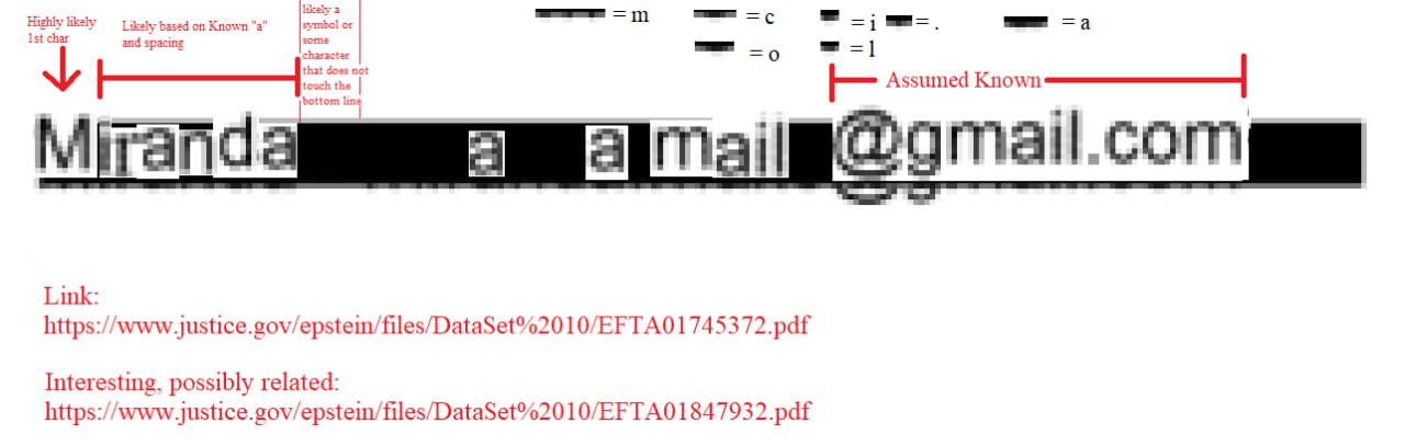 Hopefully i am not too late. I spent several hours on this. I have other things to do now and will leave you with where I stopped. Note:• The "a" s between "miranda" and "mail" are my least confident guesses so feel free to ignore those if needed. • Next least confident, but mire confident than those "a"s is the "mail" before an unknown char and @gmail.com. • third, but nearly confident is the "Miranda"• fourth, high confidence, i think everyone sees is the @gmail.comLink:https://www.justice.gov/epstein/files/DataSet%2010/EFTA01745372.pdfInteresting find that may or may not be related:https://www.justice.gov/epstein/files/DataSet%2010/EFTA01847932.pdf