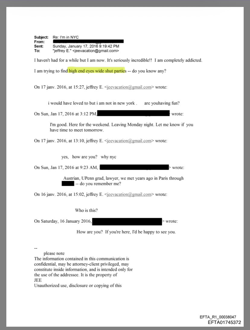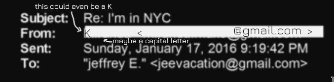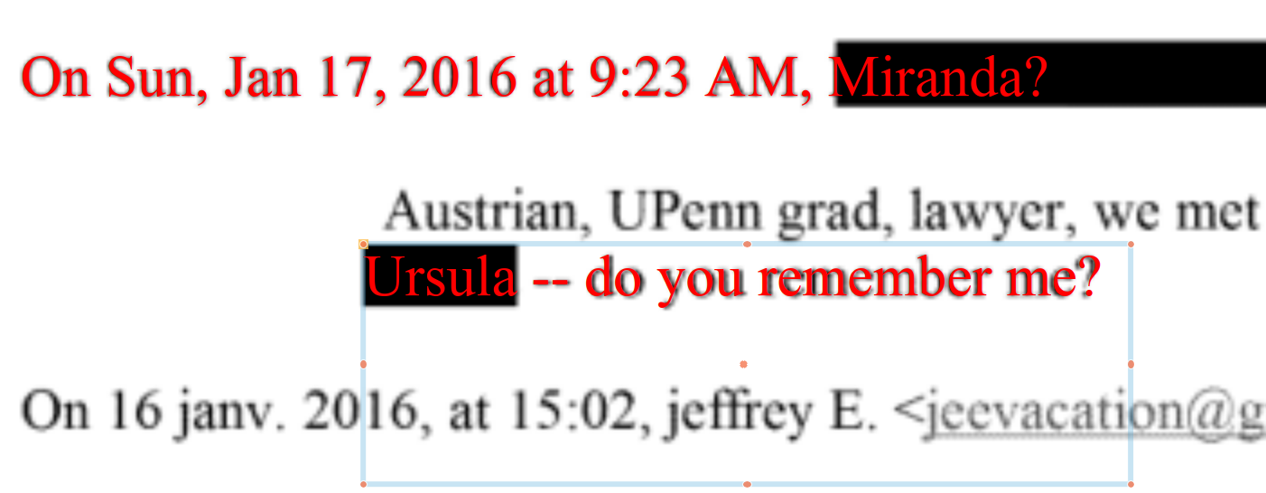 >>527618439The first thing you should know is that because this is a scan of a printout on paper that once you go beyond a few words it's going to drift. That said, for something like an email it may be short enough (especially if you can assume it's a gmail address). If you look very closely at the redacted e-mail on the 17th at 9.23 AM in the reply body, you can see two very small lines jut out to the left of the redaction because they didn't cover it fully. A capital M for first name does fit that. But it could also be other letters (but it's not many that line up).She admits she's Austrian. Assuming the email starts with her first name then you should be looking for names that are more typical from the country.Also the font of her email at the top of the document (where it's indicating the main metadata from Epstein's email at the top of the document). It looks like it's Longhorn Regular (otf) type font that's used on Windows for the font. If it's not that, it's got to be one very similar to it (look at how E is displayed). Take a look at the font itself (type out some text and see).The email body, like Epstein's signature is Times New Roman, take a look at the E for example, see how the shape of it are quite specific and match the font. I was able to get it to line up exactly with with size 12 on the email body so now you can guess to your hearts content once you type out the existing letters (helps if you use a different color).Note the date time (likely from her email client) showing what Epstein wrote are formatted like:"16 janv. 2016" - which “janv.” is the standard French abbreviation for janvier (January). So her email client is set to French. This is also a hint. Given she mentioned Paris it would be fair to assume she actually speaks it naively (despite being Austrian). By the way Maxwell was born in France and speaks French fluently. We don't get the name of the girl she claims introduced her to Epstein but it's short. Pic related.