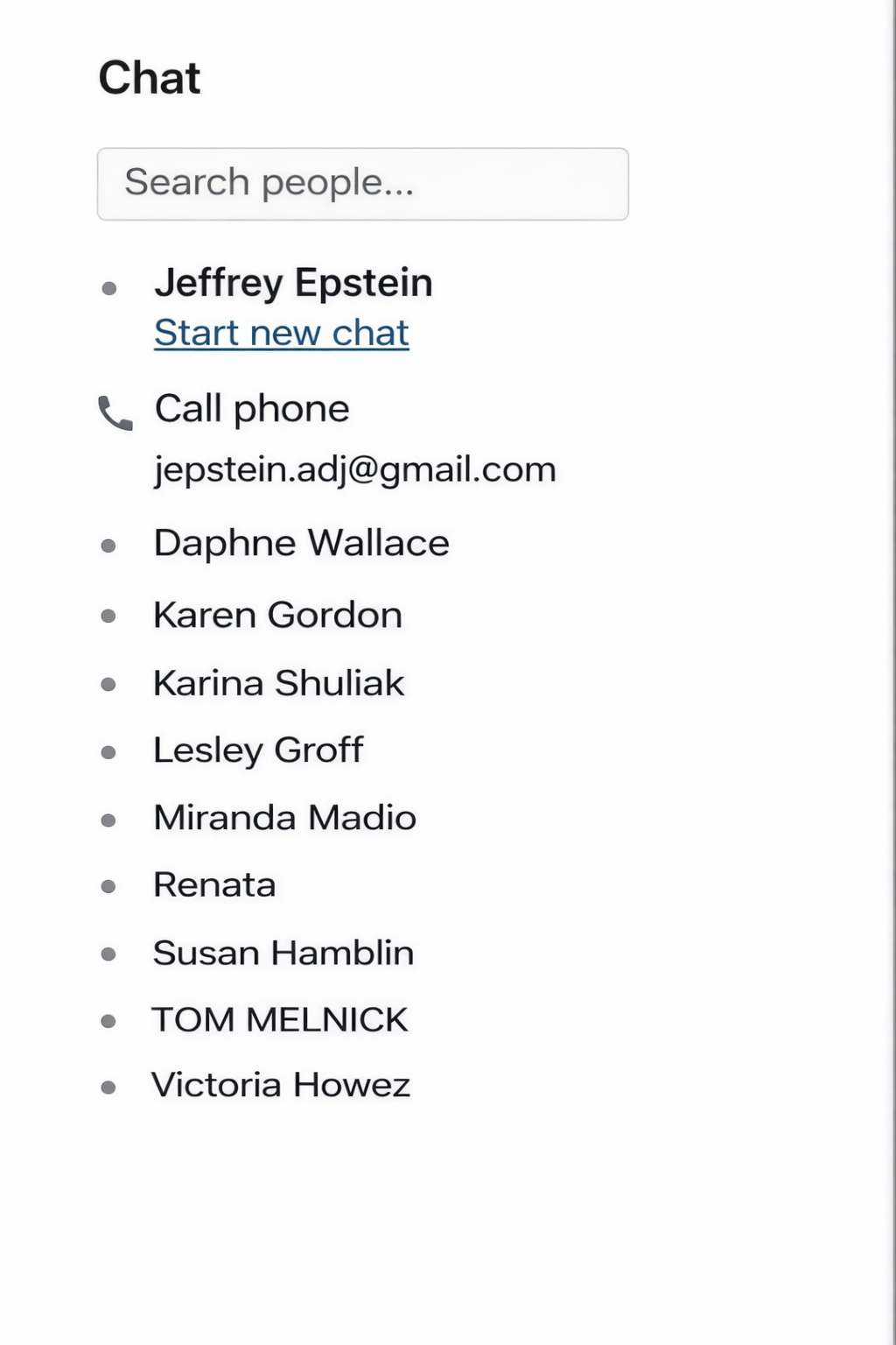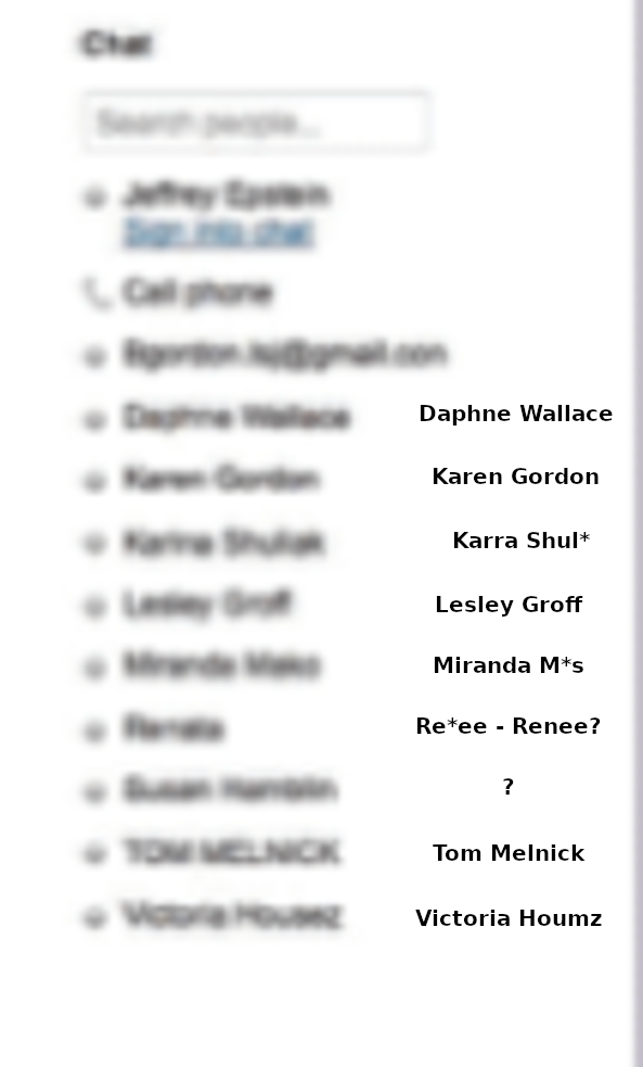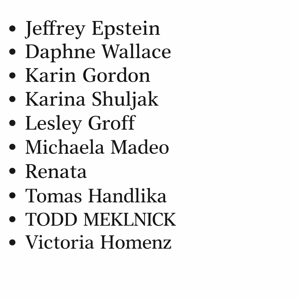 >>527640881Jeffrey EpsteinDaphne Wallace???Karyna Shuljak <- CONFIRMEDLesley Groff <- CONFIRMED(???) (possibly a Madeo)Renata <- plausible????Tom Melnick <- CONFIRMED???Tried an ai clarify pass but it kind of sucked. Look at the text in my post, not the photo. The photo is only a reference for what I was able to get. Confirmed names show up in full on a search on DoJ search. Renata does show up, but unsure if it was what was actually listed in the original photo