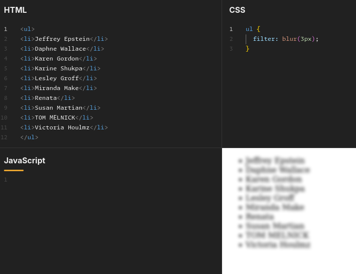 >>527632682>I don't think that image says "Moss" because the two last letters aren't the same height. It looks like Make or something with an outline like that.That image is actually the result of typing "Karen Moss" and blurring it on that live html site: https://jsfiddle.net/u2b03dsp/Can't be sure though. It's very close to looking like the name on the contact list, but not identical.I don't know why the tail sticks out of the top of the first 's' but not the second.