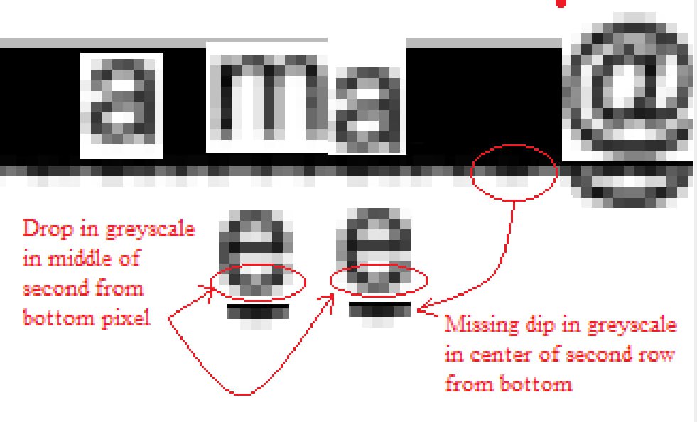 >>527622552Idk, from your own pic Idon't think it matches. The right and middle leg seem almost correct, but the left leg seems to be "bright pixel dark pixel" on the "m" and "dark pixel bright pixel"on the original, which would indicate that the leg on the "m" is less than a pixel to the right while the one on the original is less than a pixel to the left.Again, I might be wrong, but that's what it looks to me idk.