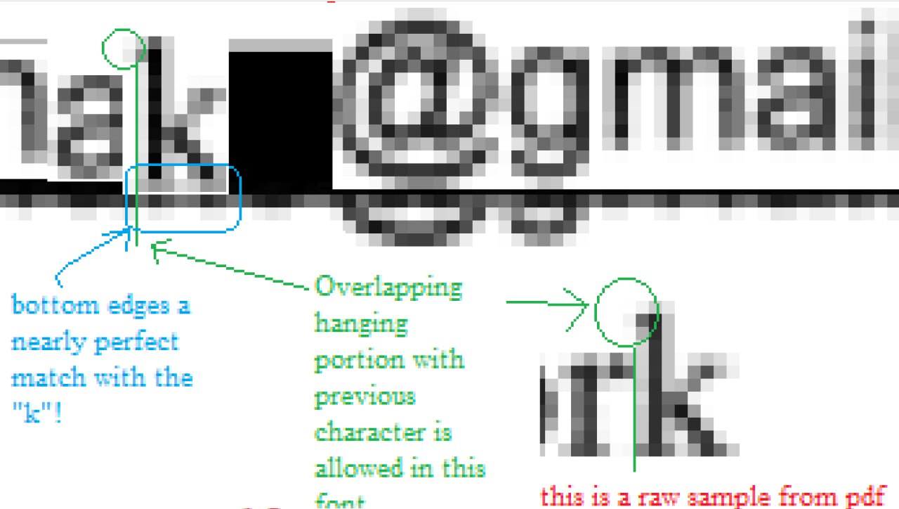 >>527621826>>527621937I am OP and that is what I did. In my image you can see where I took the assumed known of "@gmail.com" and sample the peeking parts that indicate that character. I then tried to find matches in the rest of the peeking bar. I hit on "a" and "m". the lower case "m" in mail im pretty confident in as nothing else matches. The only alternatives to the suspected "a"s is "d" and "u" to have a similar curve with a tail. After several comparisons the a just made the most sense. Third censored bar in the pdf, also partially exposes the first character side, indicating its a capital letter with a straight side. Given the three sharp lower ridges, only "M" fits. Which is why I rated the first letter with high confidence, just below the @gmail.com.
