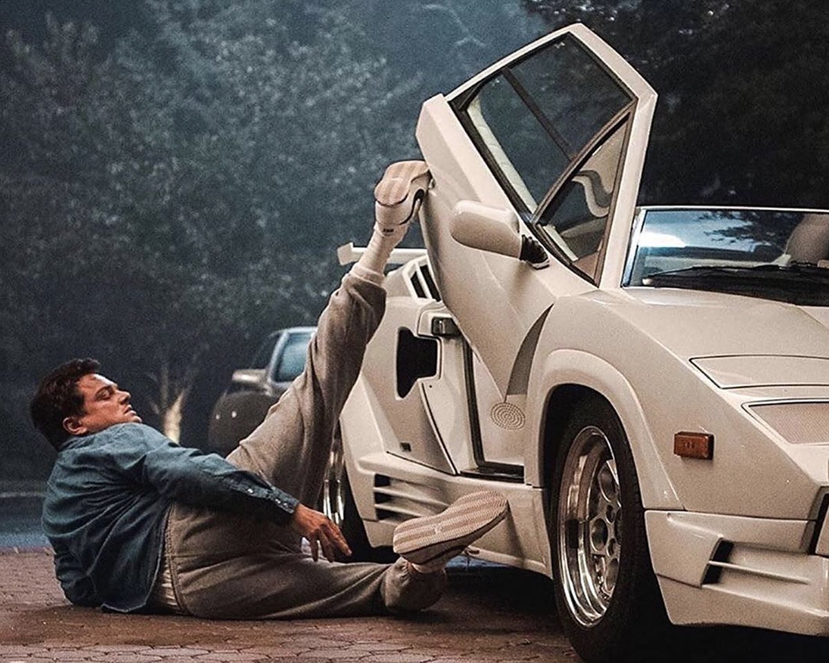 he turns to sit in his lamborghini and drives away as the gullwing door closes, rear view