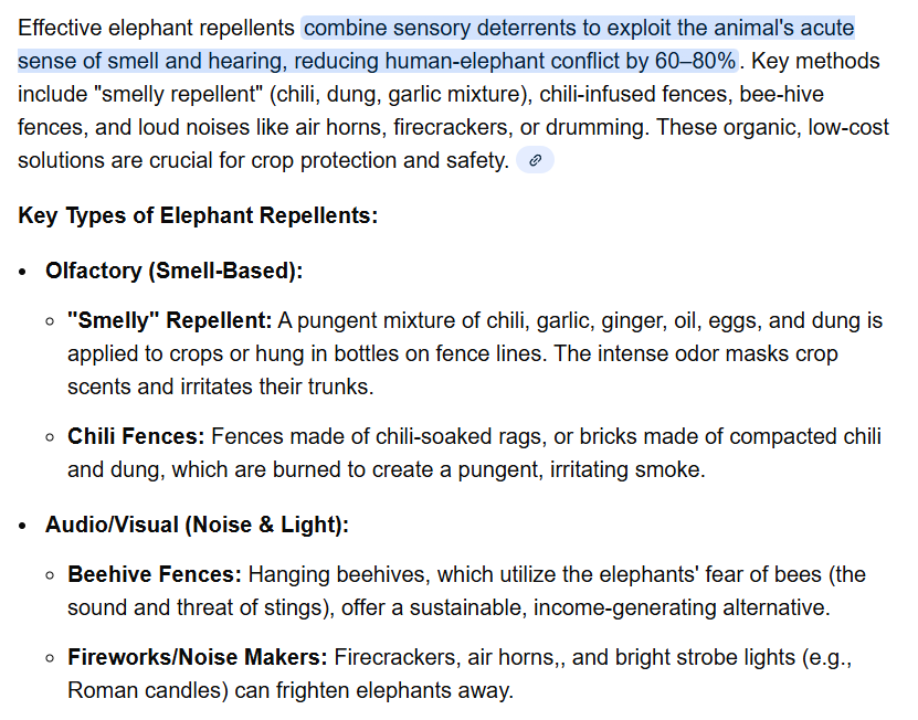 >>527651031i look it up elephant repellant or known as "smelly repellent" are chili and dung, garlic mixtureshow come jeet get stomp by elephant when they themself are pretty much a walking smelly repellent?im not joking