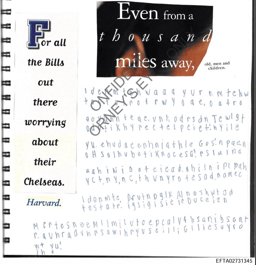 >>527658454I might work on the lot in order, I noticed the underlined poems give loose context aswell as a lot of the other imagery and pasted letters.This is insane but it seems that they stole two babies from a 16 year old sex slaveHas epstien, Ghislaine, a doctor and multiple others mentioned this document is also in code drawn in crayons and pencils, spelling mistakes and inconsistent use of letters and style or writing them as well as sounding both childish and adult.I think whoever wrote this was there for a while for the writing to be so inconsistent.The fact it's crayons is really gross like it have some crayons and draw.The person who was mentioned as uncomfortable I feel is an important bit of context niniwack? I wonder who told her to do the code