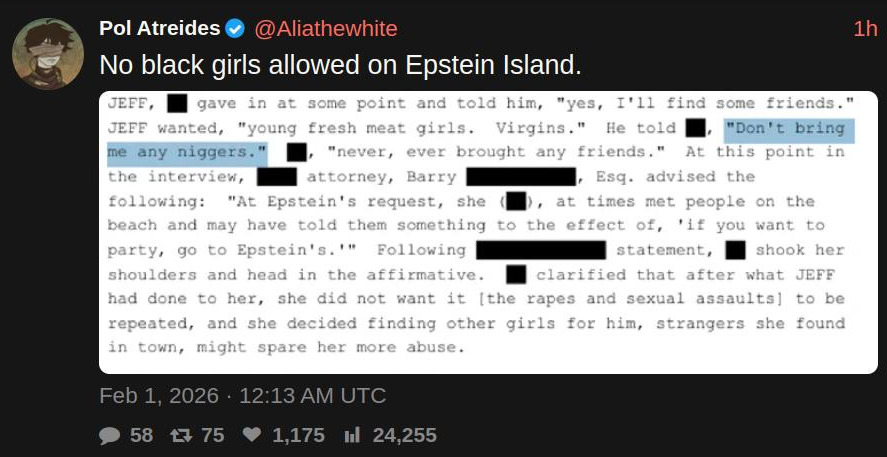 >>527651787Thank you. If you search "nigger" or "niggers" you get a lot of results in the Epstein files. But I was really surprised that this was the singular result for Negress. Even "faggot" brings quite a few results. I just would've thought a cultured, educated, and erudite man like Jeffrey Epstein, or any of his high IQ billionaire and top level political friends may have used the word Negress in a communication to him, but no, they didn't. Literally the only result is in this file which is creepy and weird, and for which I cannot find the context