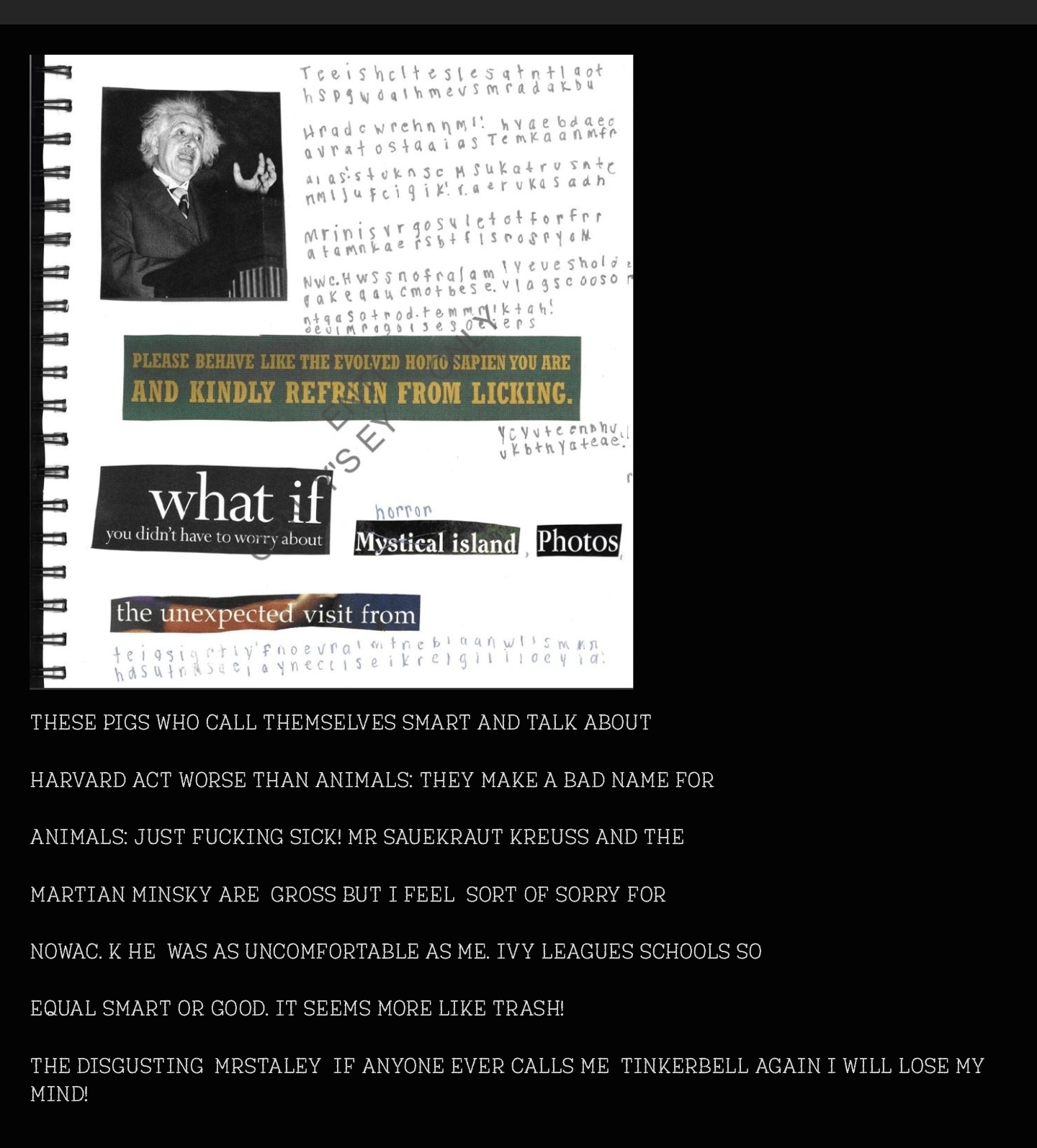 >>527659727Dan Snyder - Washington Football Team - “Dan Snyder is a pig!”Jes Staley - “The disgusting Mr. Staley if anyone ever calls me tinker bell again I will lose my mind! He left bloody marks on my arms from his belt and thought he had the right to call me that when he has ears as big as Dumbo. I should have called him that in return.”Larry Summers - former president of Harvard University, “Both he (Dana) and Larry Summers are fucking disgusting!”Donald Trump – “[REDACTED] should not brag because that was yucky! [After that sentence next to an Ivana Trump divorce quote clipping] Does this lady know you can't have any dignity if you've been with him? I know I have none. Only skittles”Lawrence Krauss - theoretical physicist – “Mr. Sauerkraut krauss and martin minsky are gross but I felt sort of sorry for Mr. Novak.” Ms. Vicki Ludwig Vogelgesang ? – “I am lost. Mr. Mody. Mr. Robert. Mr. Sant. Mr. Ludwig. Mr. Cecchi. Mr. Mora.”George Vradenburg – senior executive at AOL - “Mr. vradenberg and Bill s.”Harvey Weinstein – former Hollywood producer - “Being able to tell you what Ms. Vicki does and what really happens in FL and CA. I hope you don't ever meet fat pig Weinstein or the rest.” Jean Luc BrunelAndrew (Mountbatten Windsor) “I guess it is a royal thing. Gross! Andrew is like his brother in this way! XXX should not brag because that was yucky!”